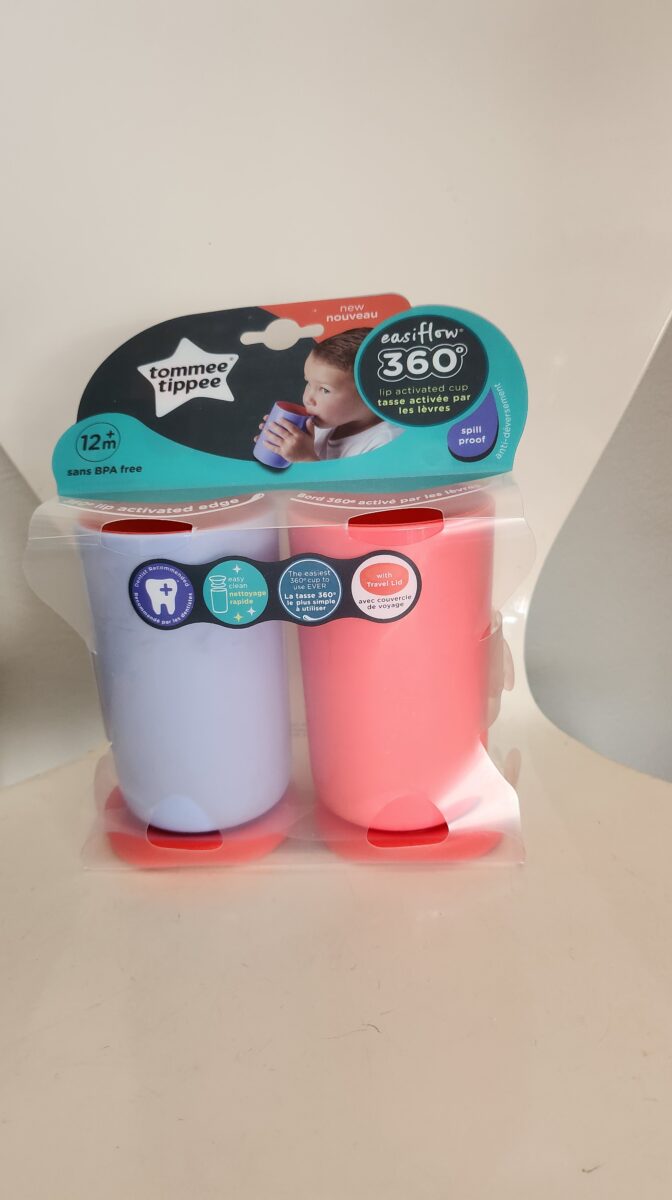 Paquete de 2 vasos entrenadores marca Tommee Tippee Easyflow 360° con tapa nuevos, antiderrame para mayores de 12 meses