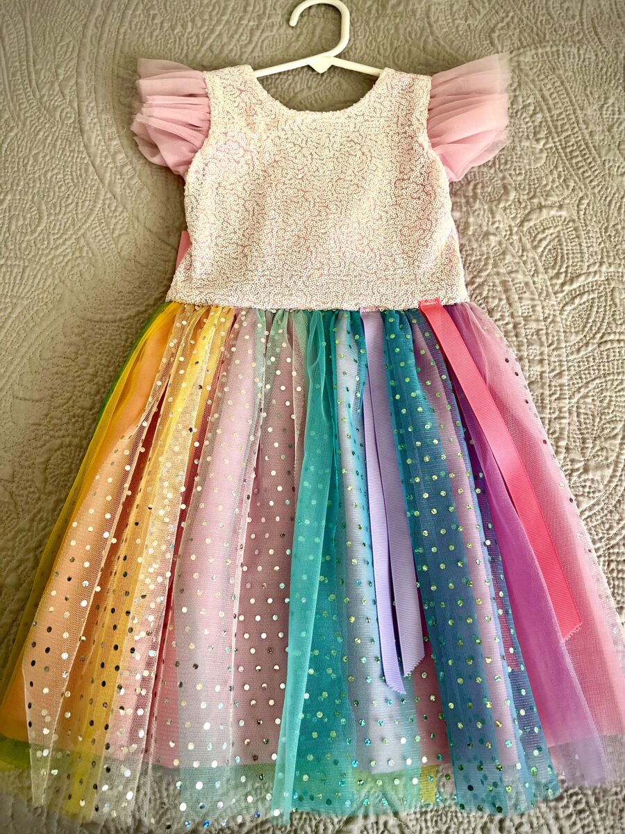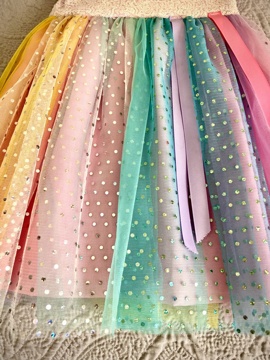 - 🌈 Vestido Arcoíris hecho a mano con falda de tul suave y detalles de lentejuelas rosas.