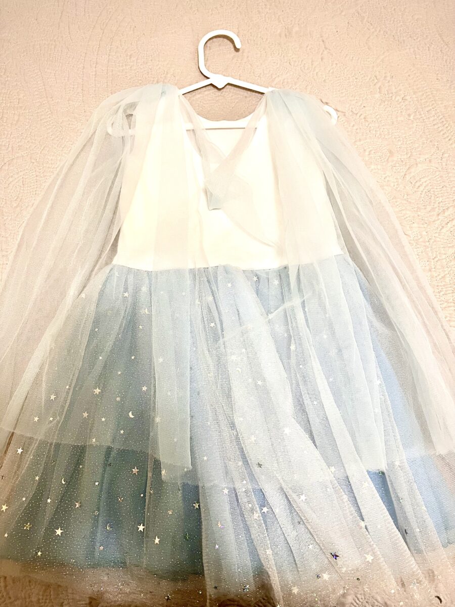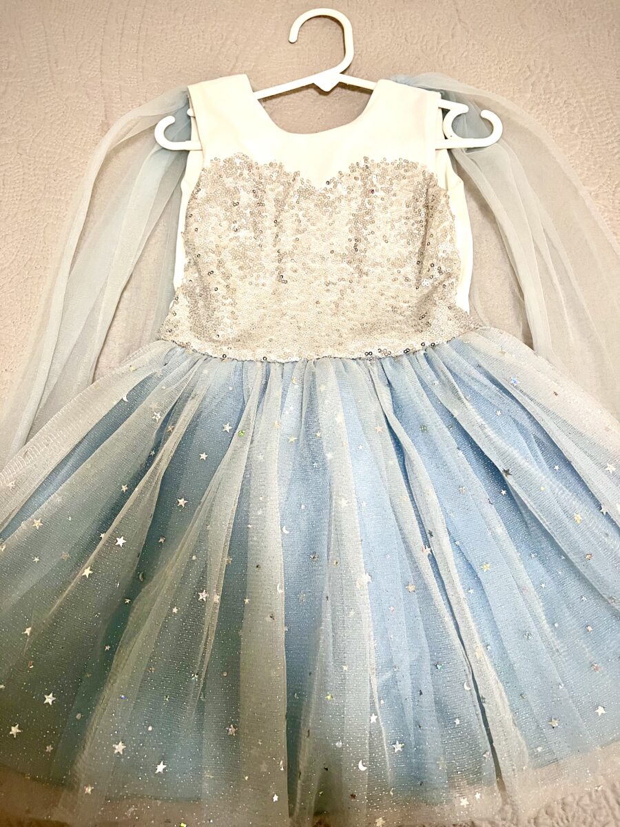 - ❄️ Vestido Frozen Elsa, también hecho a mano, con corpiño de lentejuelas plateadas y falda azul con estrellas y brillos mágicos.