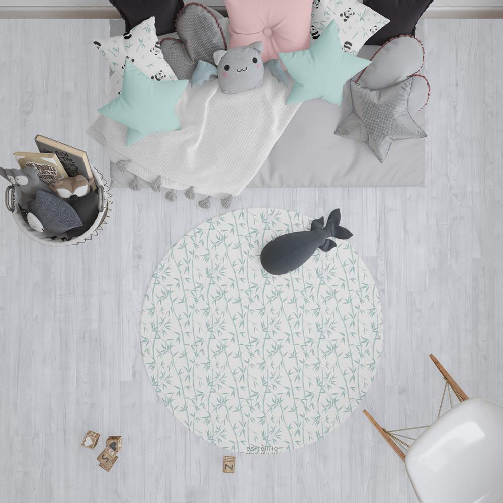 Puedes encontrar esta alfombra redonda Bambú a juego con textiles, vinilos, láminas,… todo en la colección Bambú de nuestra tienda. De manera que puedes decorar toda la habitación de tu pequeño con el mismo tema.