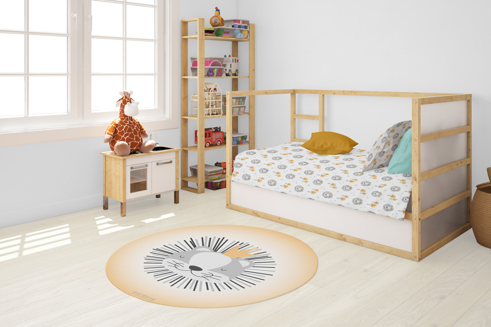 Puedes encontrar esta alfombra redonda a juego con textiles, vinilos, láminas, papel pintado… todo en la colección Rey de la Selva de nuestra tienda. De manera que puedes decorar toda la habitación de tu pequeño con el mismo tema.