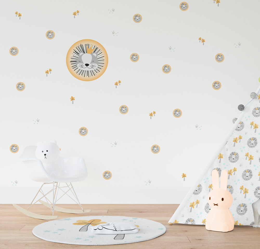 Puedes encontrar esta alfombra redonda Palmeras Rey de la Selva a juego con textiles, vinilos, láminas, papel pintado… todo en la colección Rey de la Selva de nuestra tienda. De manera que puedes decorar toda la habitación de tu pequeño con el mismo tema.