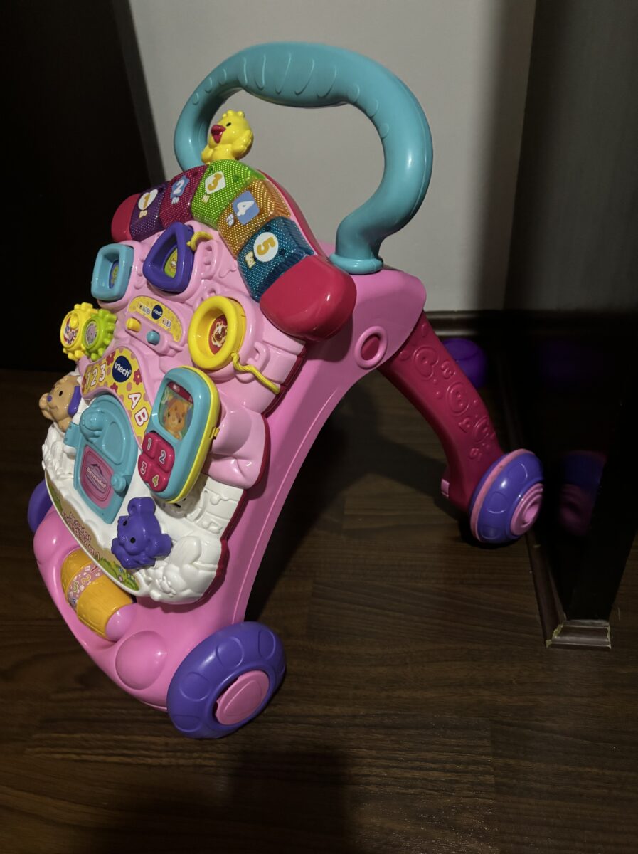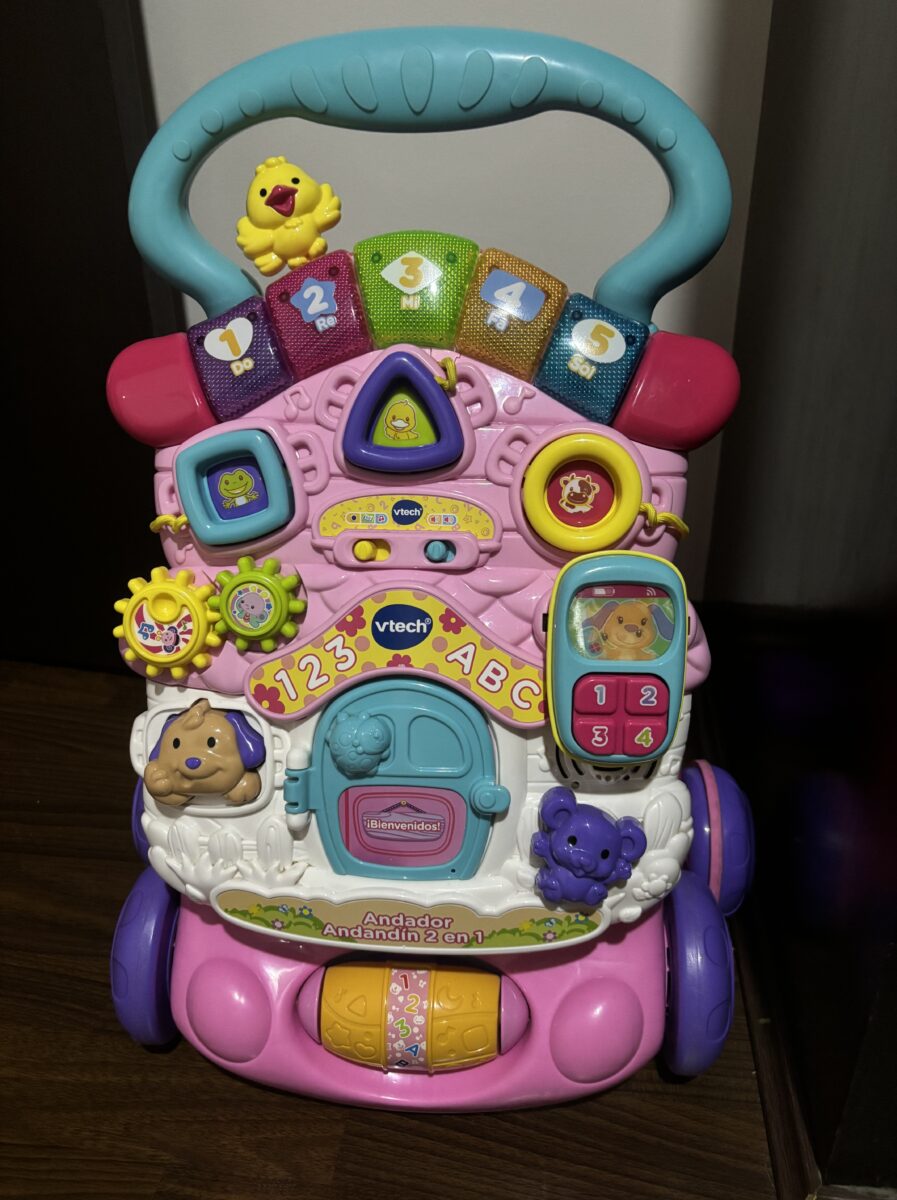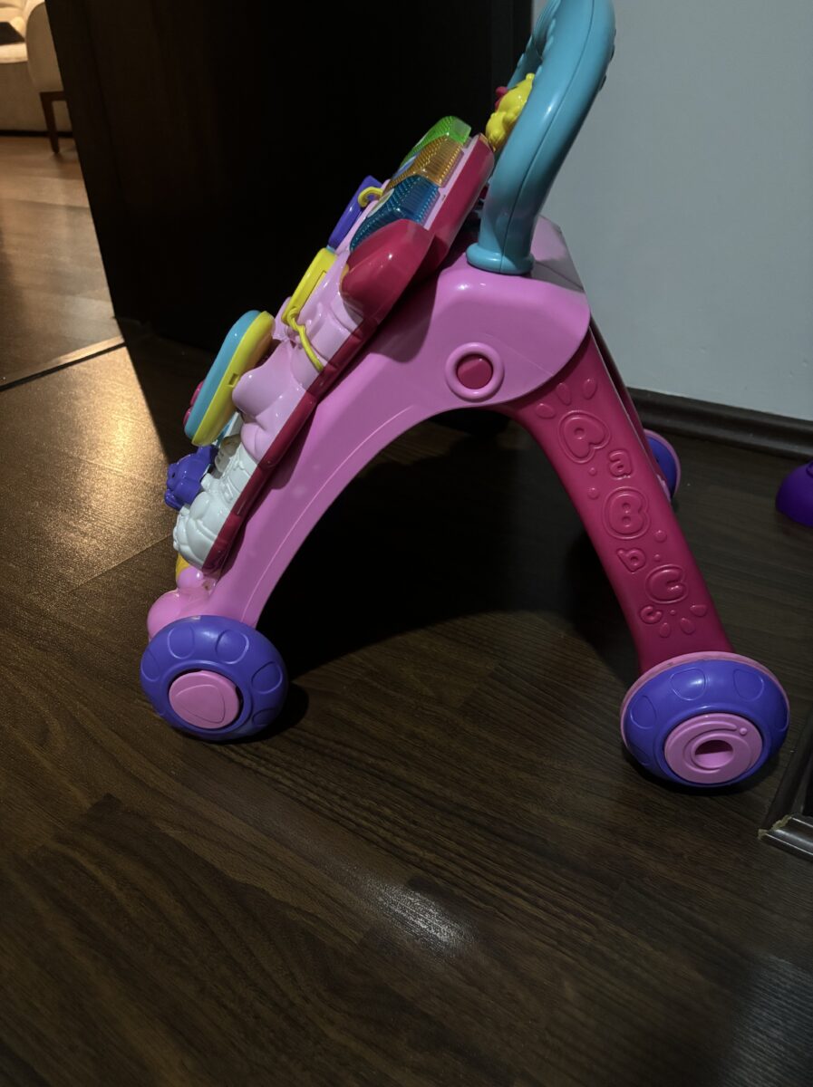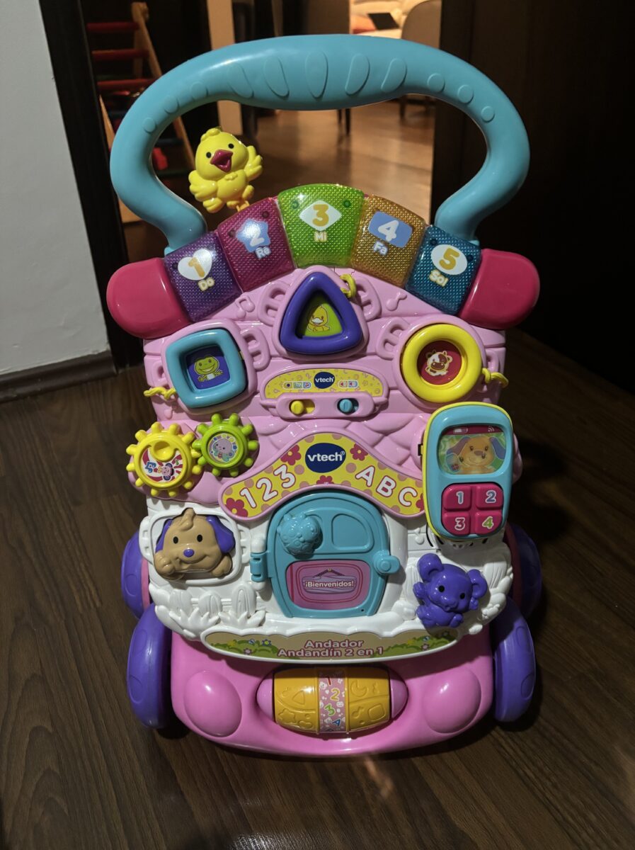 Ideal para niñas a partir de qué se sienta, tiene música y sonidos, muy bueno para empezar a caminar. Tiene muchos botones y funcionalidades que entretienen muchos a los bebes.