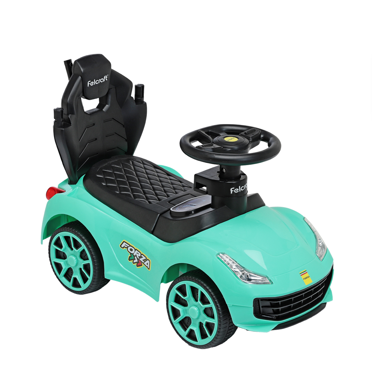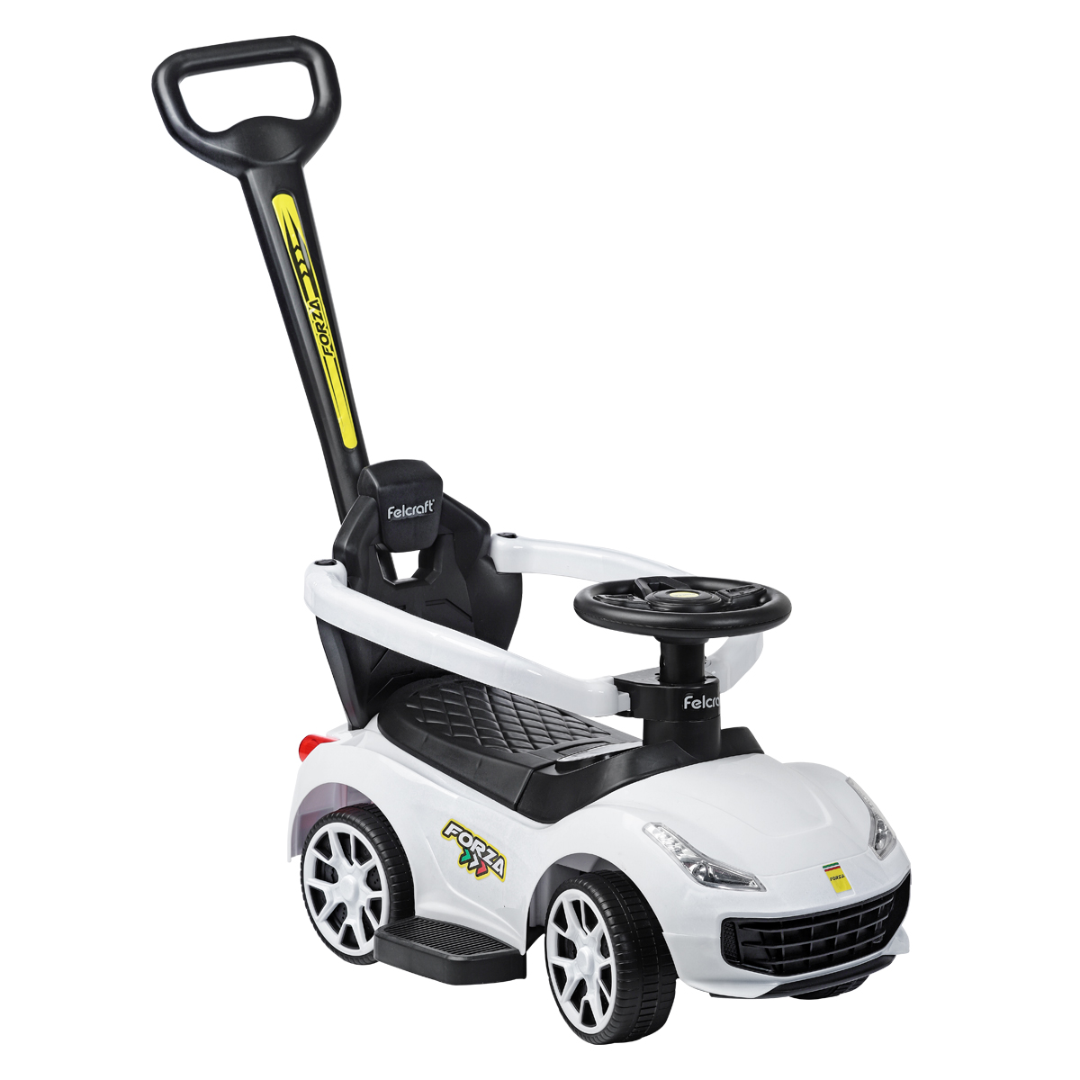 El andarín FORZA de Felcraft presenta barrales laterales de seguridad (los cuales pueden ser removidos cuando el niño es más grande) manija de empuje direccional, y asiento guarda objetos. Además cuenta con una divertida botonera con sonidos.