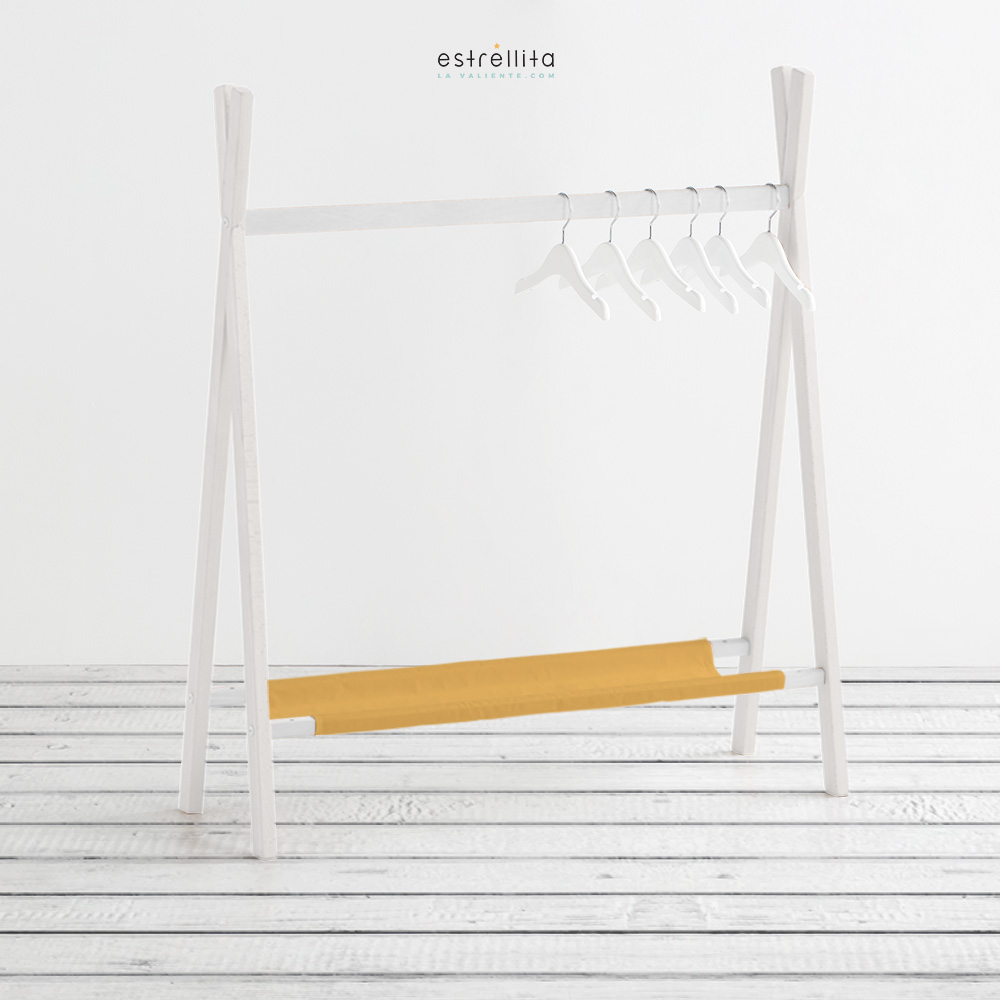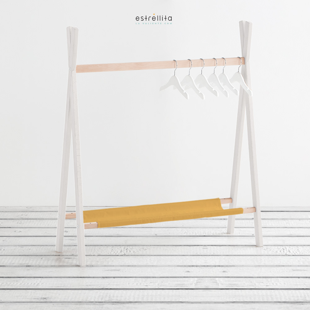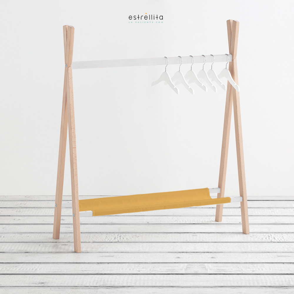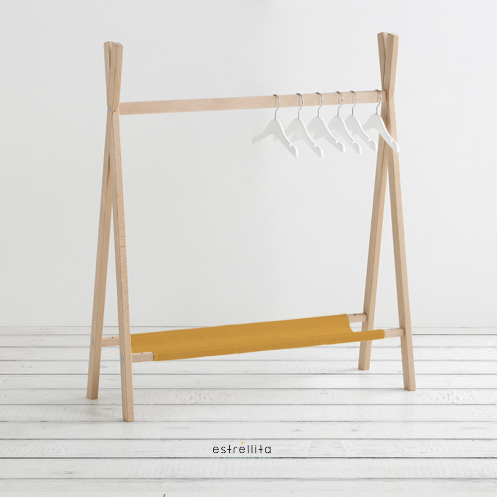 El bajo perchero liso mostaza es el accesorio ideal para poder utilizar en tu perchero de madera en forma de tipi.