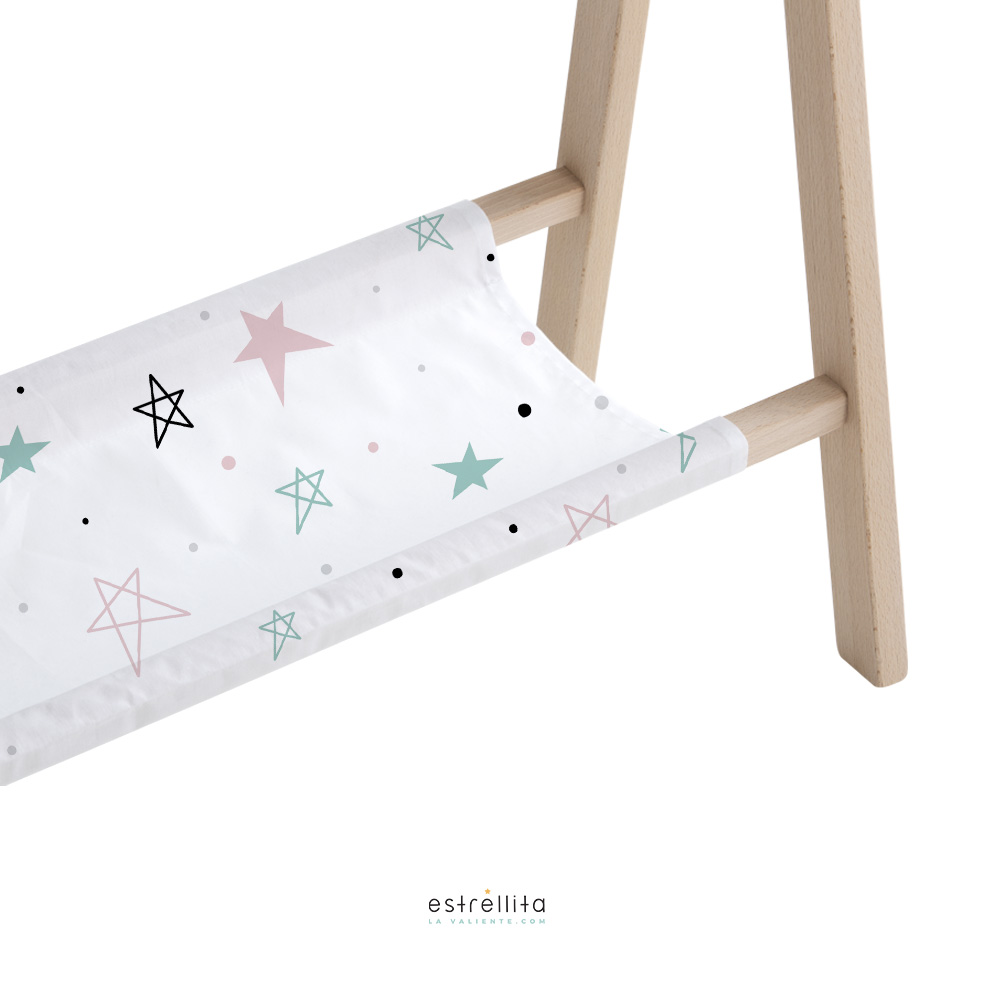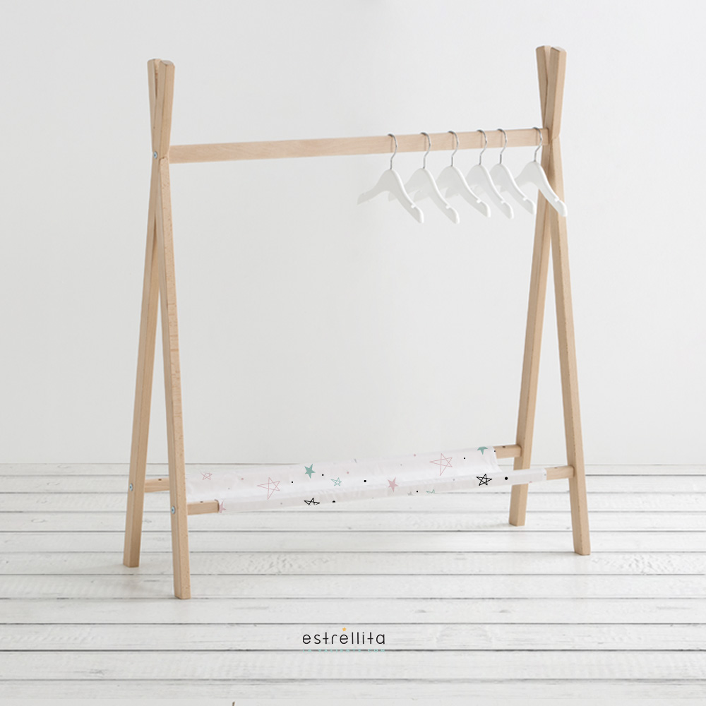 El bajo perchero Noche estrellada rosa es el accesorio ideal para poder utilizar en tu perchero de madera en forma de tipi.