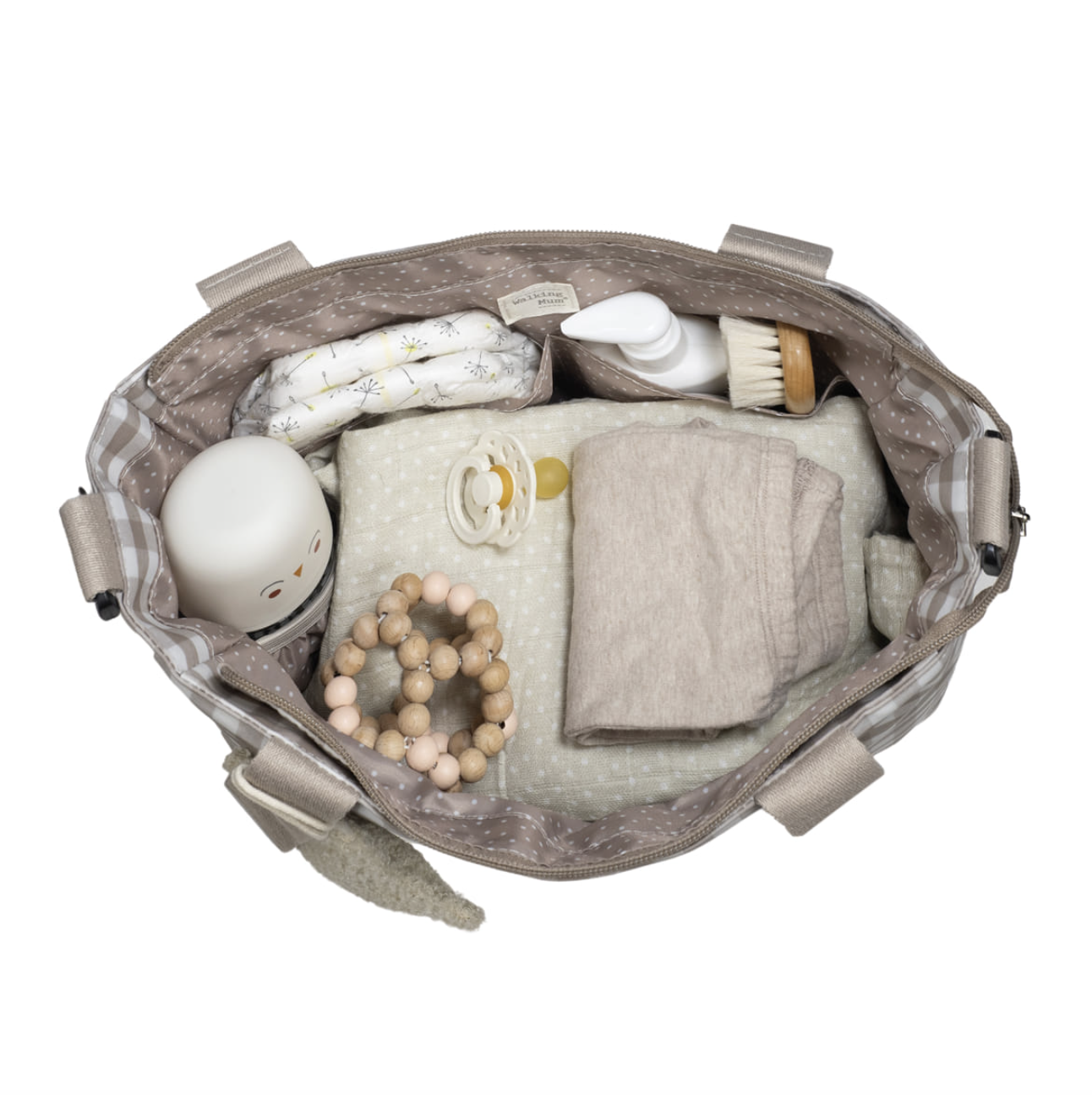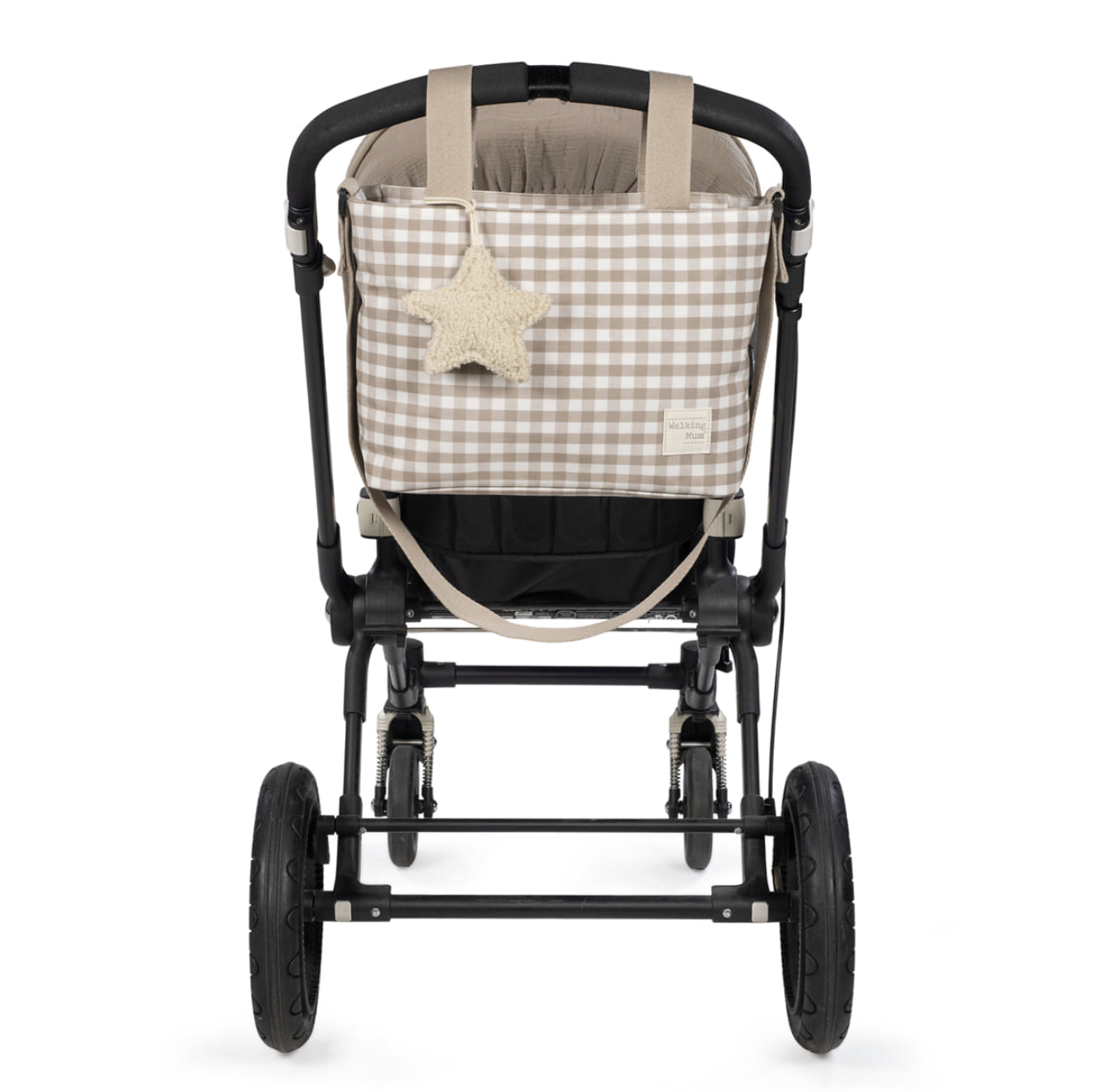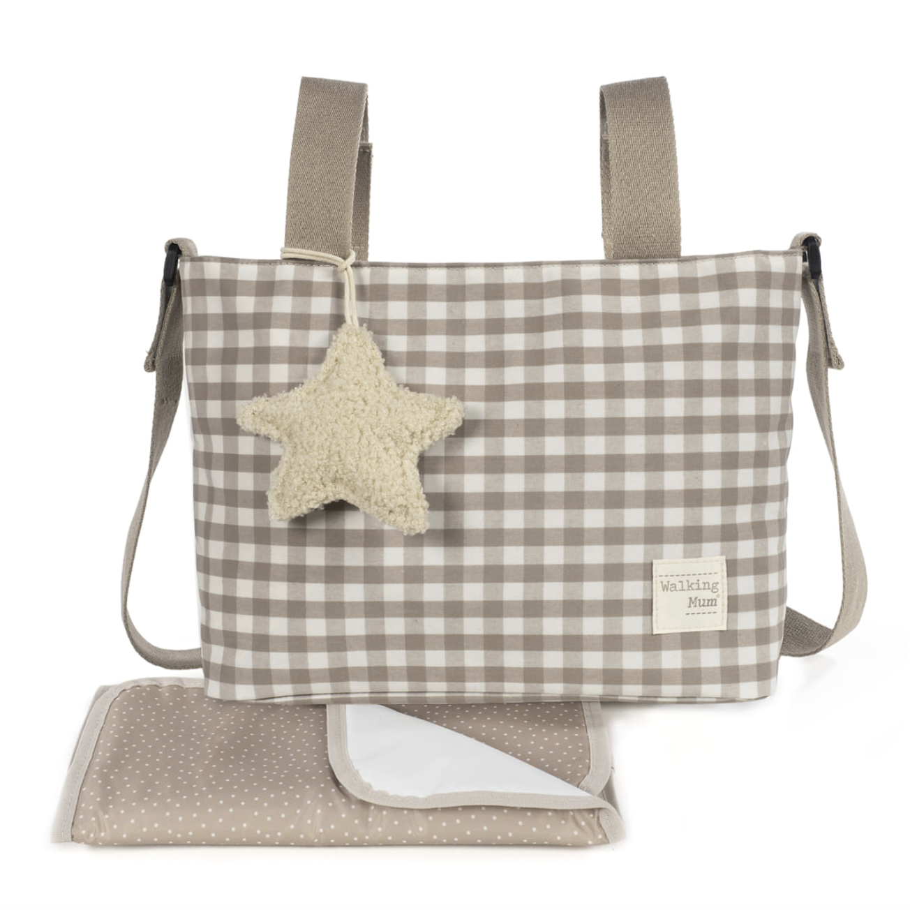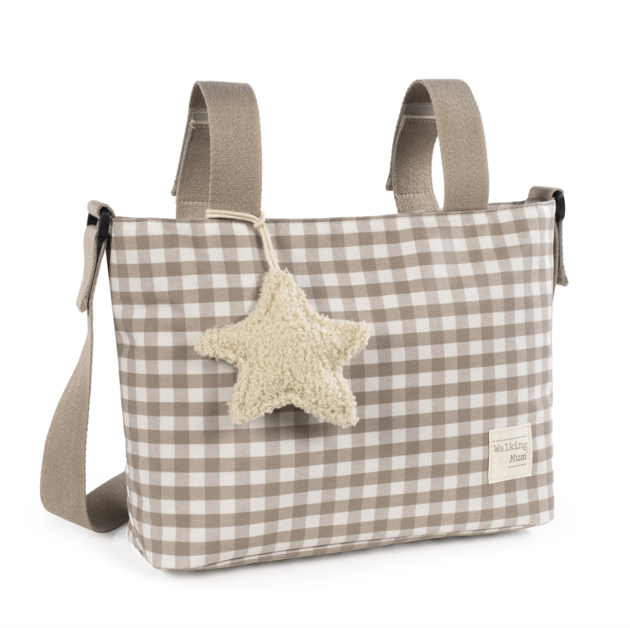 El bolso crossbody Caetana Sand de cuadros beige para silla de paseo es un modelo muy ligero además de ser resistente y espacioso para que puedas llevar todo lo que podrías necesitar durante el paseo de tu bebé. Incluye un charm en forma de estrella donde puedes bordar el nombre de tu bebé para personalizar el bolso. Aparte de la gran capacidad que tiene, está distribuido para facilitarte la organización, con varios bolsillos interiores que te ayudarán a colocar todos tus complementos ordenados y así puedes ubicarlos más fácil cuando vayas a usarlos. Dispone de un bolsillo plastificado interior para la ropa húmeda, un bolsillo térmico interior y dos bolsillos laterales. Incluye cambiador. Su diseño moderno y casual lo hacen perfecto para usar a diario y combinar con tus looks casuales o deportivos. Incorpora asas cortas con las que puedes fijarla a cualquier modelo de silla de paseo y asa larga para que te la puedas colgar en el hombro. Gran calidad y mucho estilo. Fabricado en algdón 100% con un tratamiento waterproof, de fácil limpieza a mano o a máquina a 30 °C. Walking Mum protege a tu bebé utilizando los mejores tejidos, libres de colorantes azoicos y sustancias nocivas para la salud. Nuestra colección Walking Mum está diseñada con un particular sello de estilo urbano y moderno que no pasa desapercibido, para vestir diferente los paseos con tu bebé. Las bolsas de maternidad de esta línea son más sport y prácticas, especialmente pensadas en mamás y papás modernos que aprecian los diseños más actuales y en tendencia sin dejar de lado la calidad y la funcionalidad de los accesorios que complementan y hacen más cómodos todos los paseos con sus bebés. Especificaciones: Materiales: 65% algodón /35% poliéster plastificado. Medidas: 33X25X12 cm.