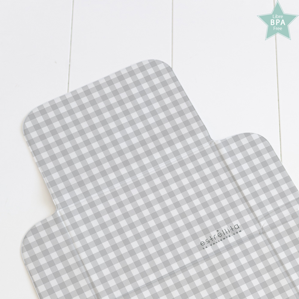 El cambiador plegable cuadro vichy gris es un práctico complemento de los paseos de tu hijo o hija. Y es que te permite realizar los cambios de pañal o ropa con total comodidad.