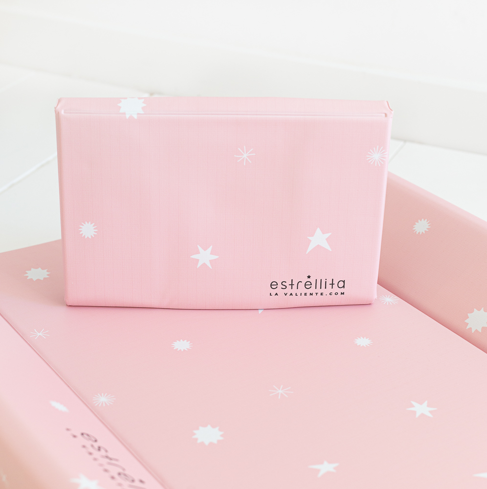 Este cambiador se ha realizado en PVC de gran calidad, de color rosa suave. En una de sus caras exteriores se han serigrafiado estrellas de color blanco de diferentes tamaños y grosores. Lo que le da un aire muy original.