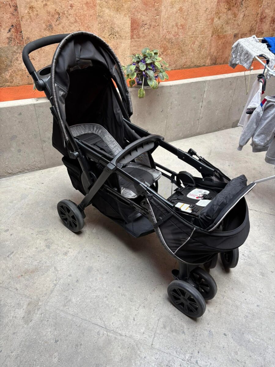 Para 2 bebés, compatible con 2 auto asientos keyfit (no incluidos). El asiento delantero se pliega hacia adelante y el trasero se reclina para colocar los huevitos, no requiere ningún adaptador. Los asientos son acolchados y con capotas independientes, ajustables y extraibles para niños mayores. Ambos asientos se reclinan en varias posiciones para mayor comodidad