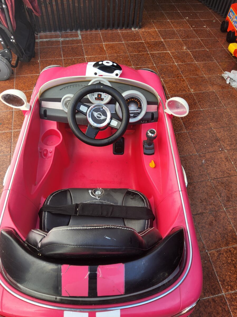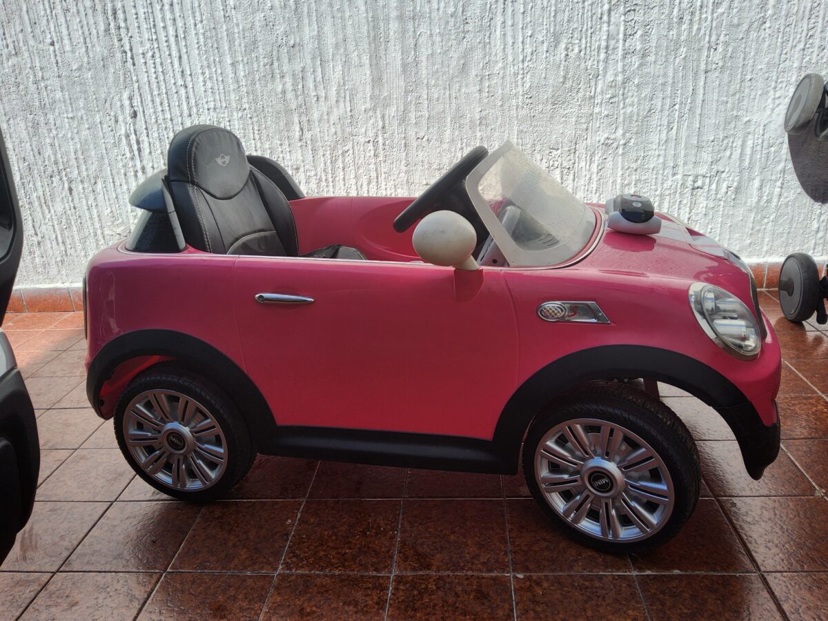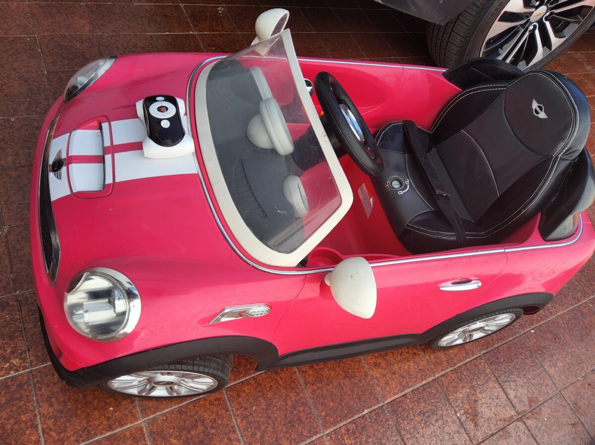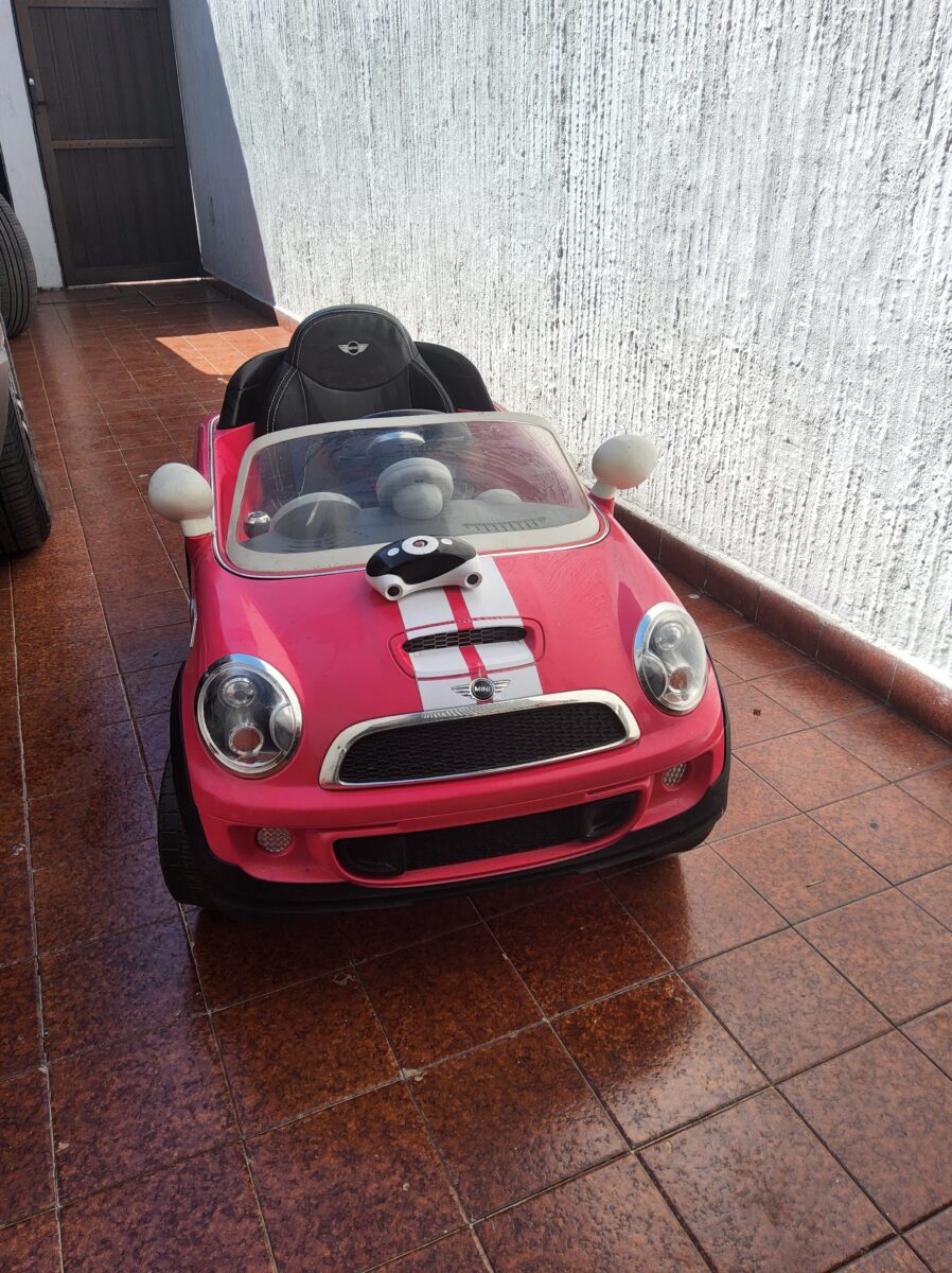 Carrito Mini Cooper como nuevo, poco uso y cuidado, tiene control remoto, 2 velocidades y reversa. Incluye radio que sintoniza las estaciones y auxiliar para música y cargador.