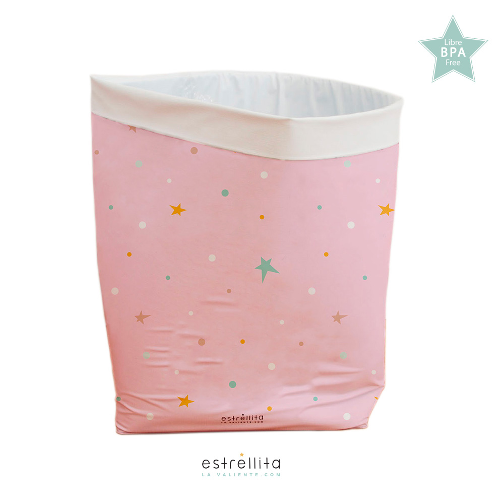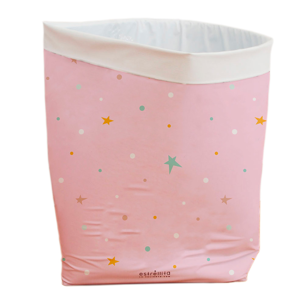 Se trata de un cesto de gran calidad, realizada en PVC de color rosa. Además, para hacerlo más atractivo se ha serigrafiado sobre su superficie una serie de estrellas de colores que le dan un aspecto muy divertido.