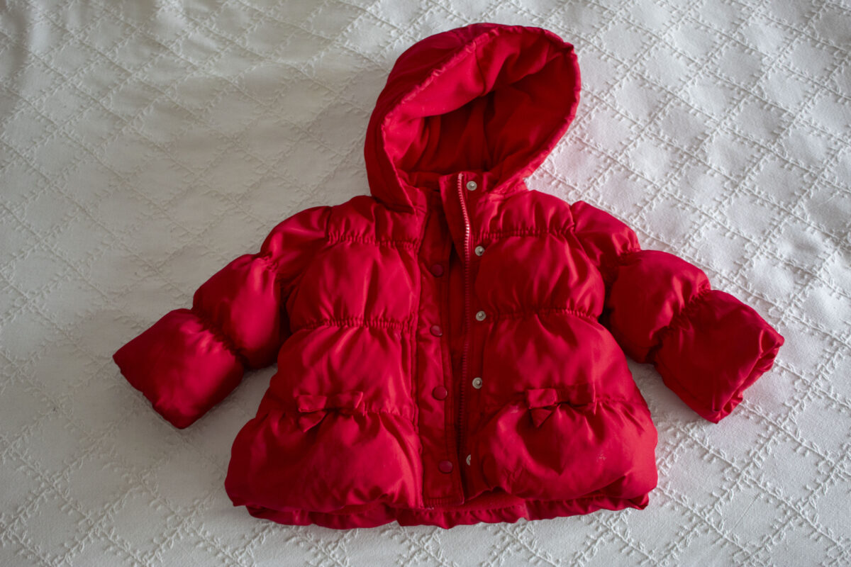 Chamarra roja para niña 12-24 meses bien abrigada. Está perfecta, pero sí tiene unas manchas (no se ven de lejos)