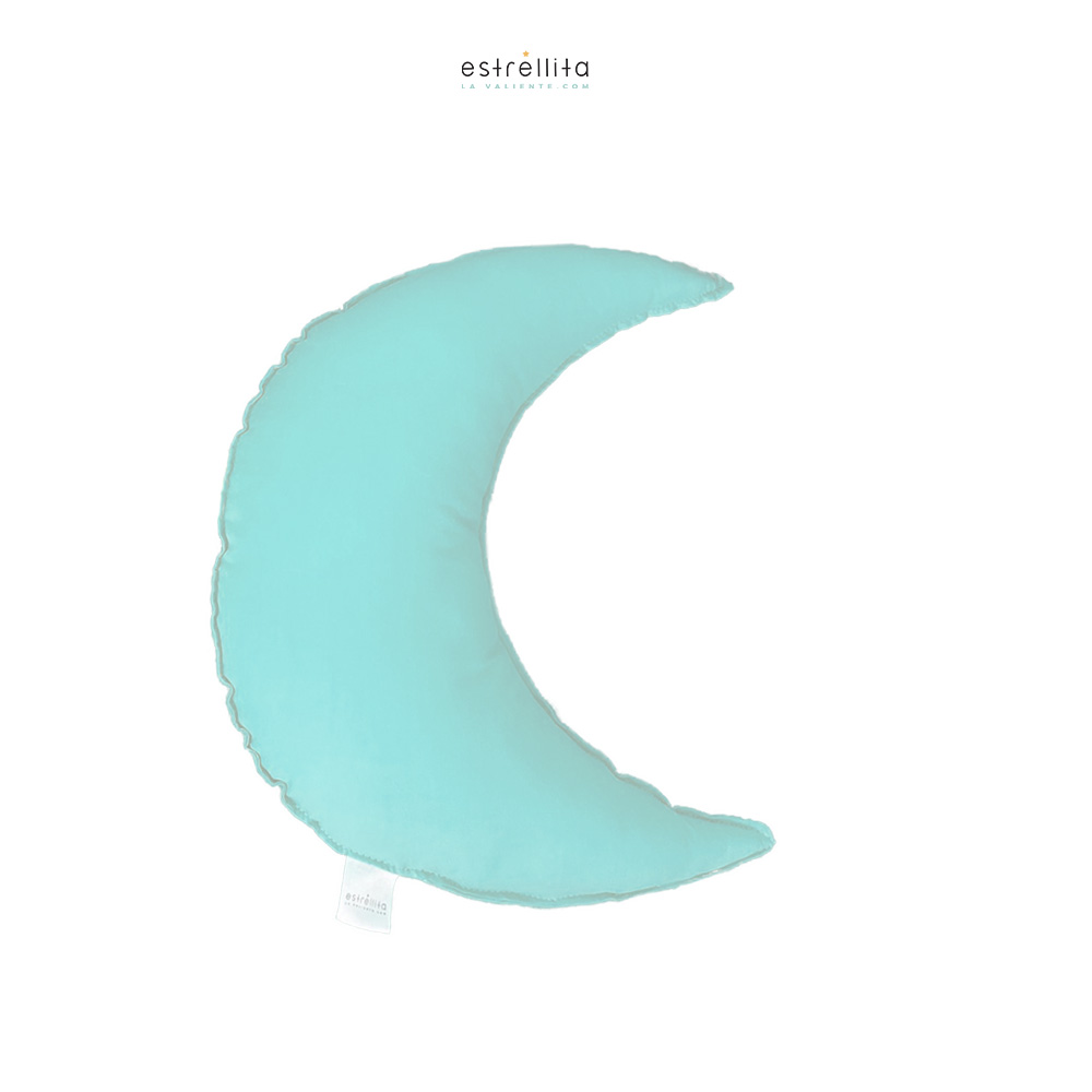 En este caso, se trata de un cojín realizado en tela 100% algodón orgánico de color mint, con forma de luna.