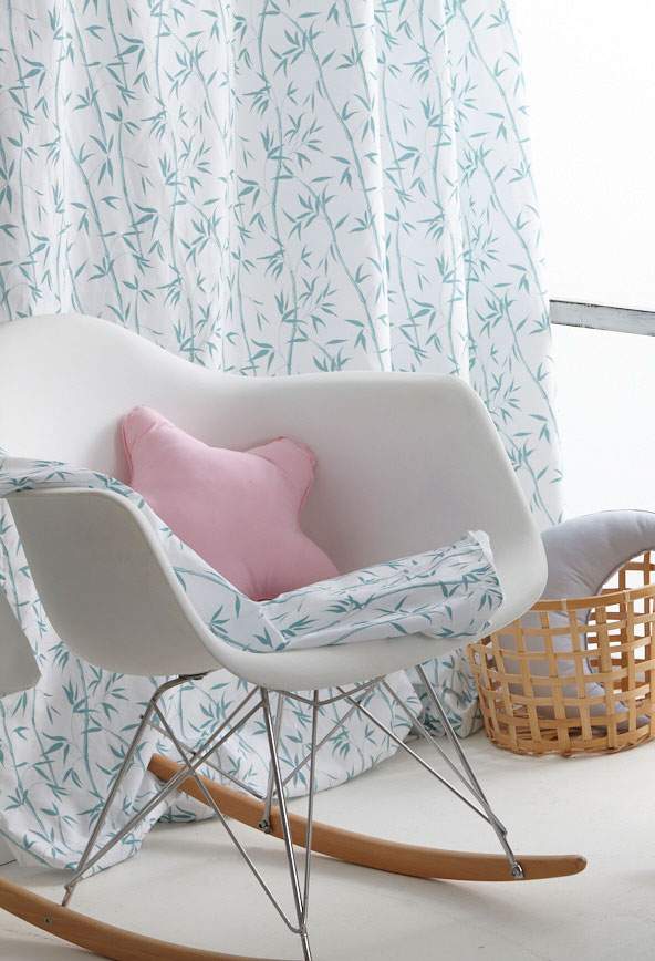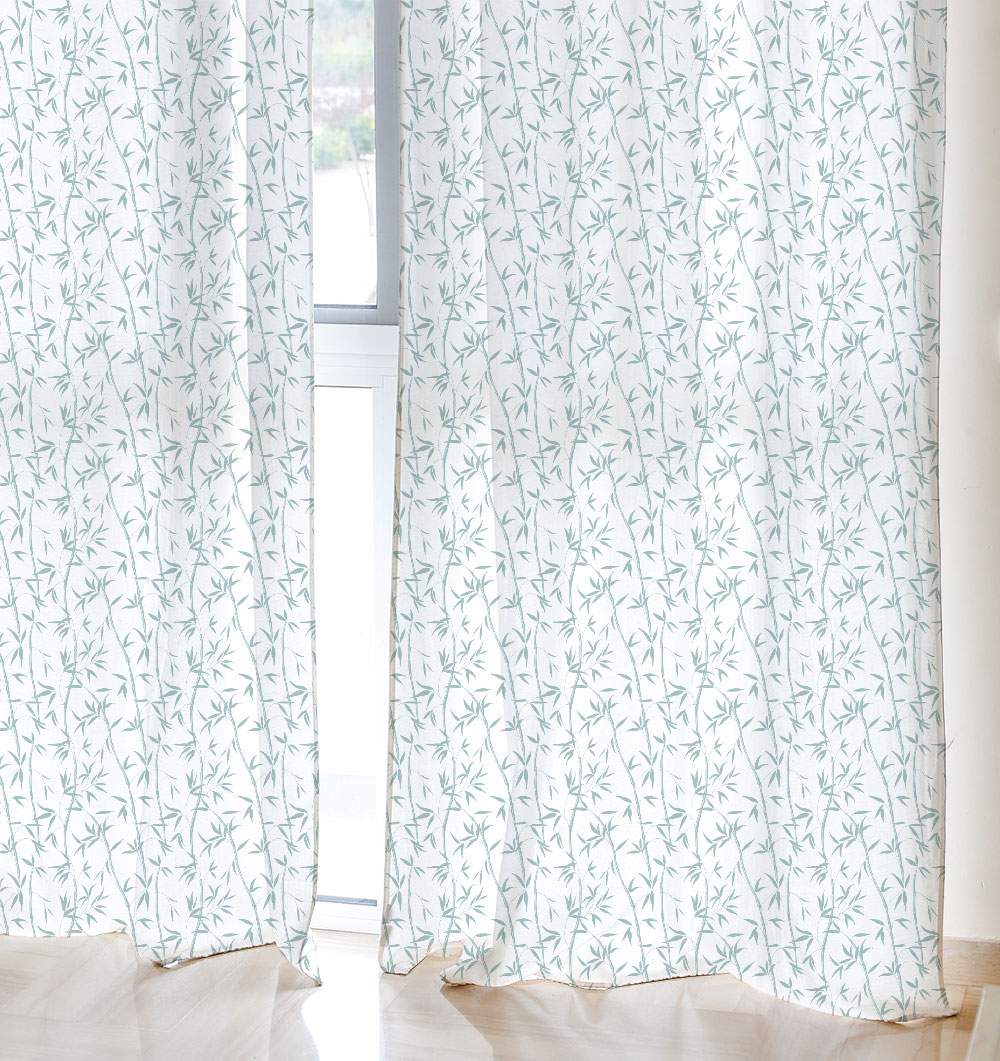 Se trata de una cortina de algodón en color blanco, sobre la que se ha estampado cañas y ramitas de bambú en color mint.