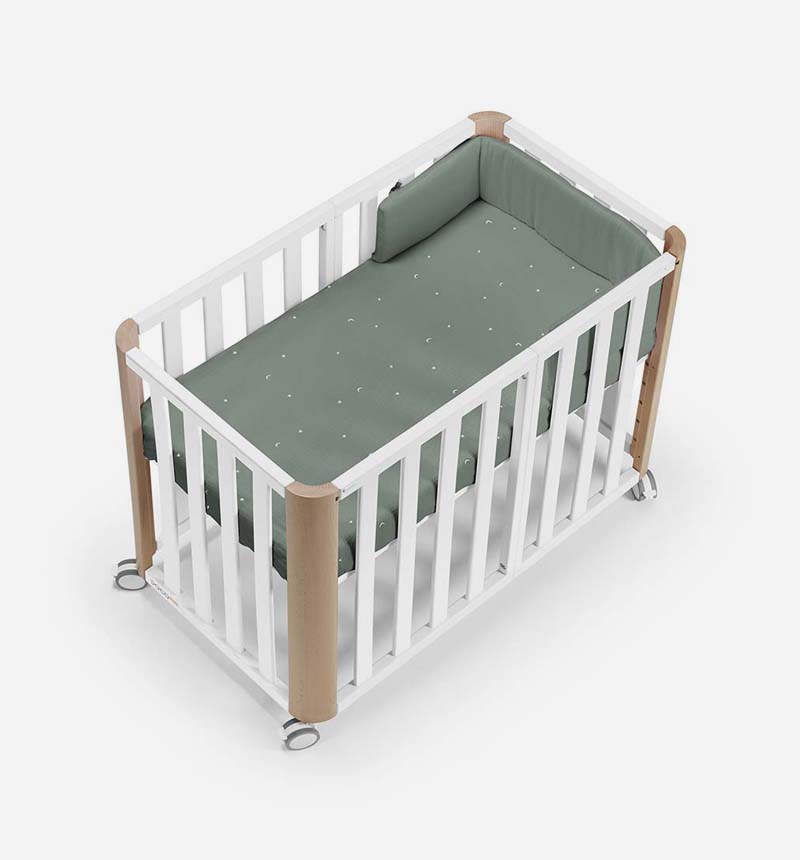 Incluye todo lo necesario desde el primer día: kit de colecho, barrera Montessori, colchón Air Foam de 90×48 cm, nórdico con protector, bajera Tencel y puente para el colecho. También dispone de somier extensible con 6 posiciones de altura, un lateral extraíble en ambas configuraciones y 4 ruedas con freno para facilitar su movilidad.