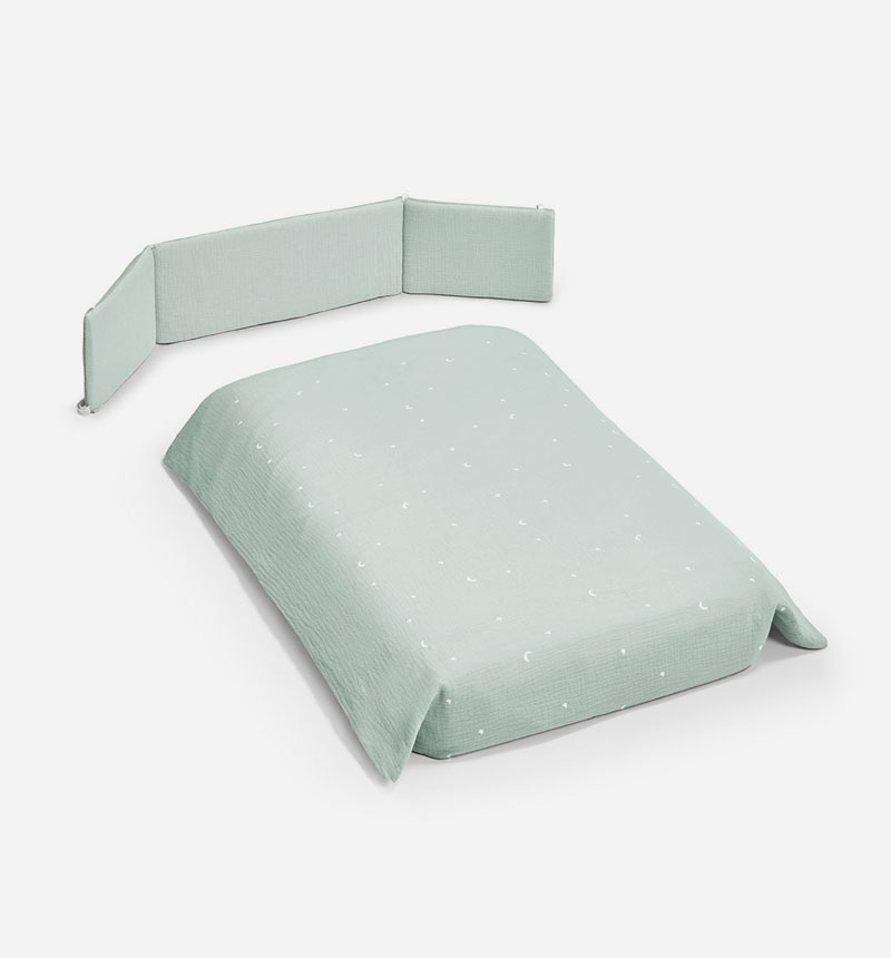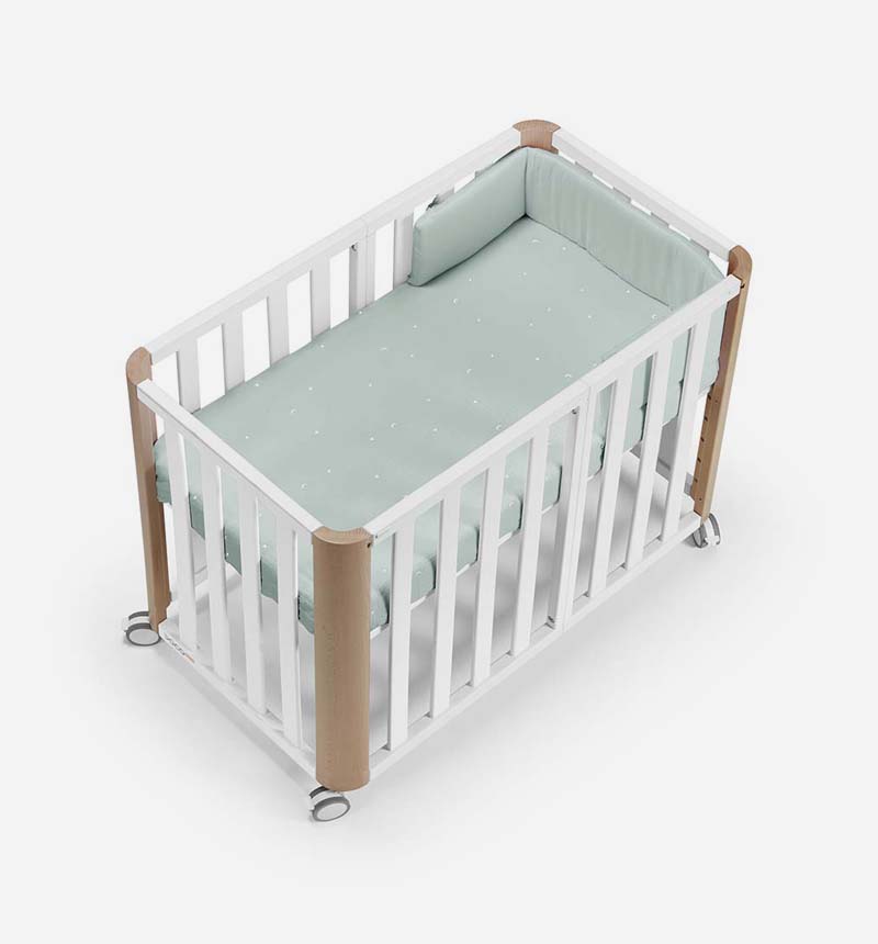 Incluye todo lo necesario desde el primer día: kit de colecho, barrera Montessori, colchón Air Foam de 90×48 cm, nórdico con protector, bajera Tencel y puente para el colecho. También dispone de somier extensible con 6 posiciones de altura, un lateral extraíble en ambas configuraciones y 4 ruedas con freno para facilitar su movilidad.