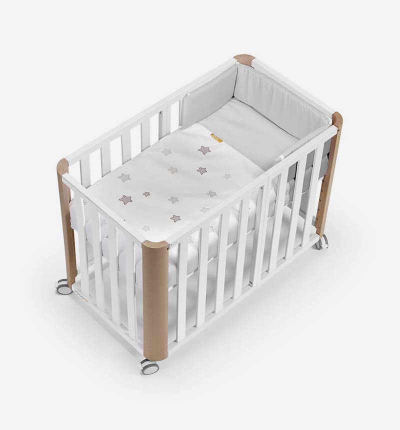 Incluye todo lo necesario desde el primer día: kit de colecho, barrera Montessori, colchón Air Foam de 90×48 cm, nórdico con protector, bajera Tencel y puente para el colecho. También dispone de somier extensible con 6 posiciones de altura, un lateral extraíble en ambas configuraciones y 4 ruedas con freno para facilitar su movilidad.