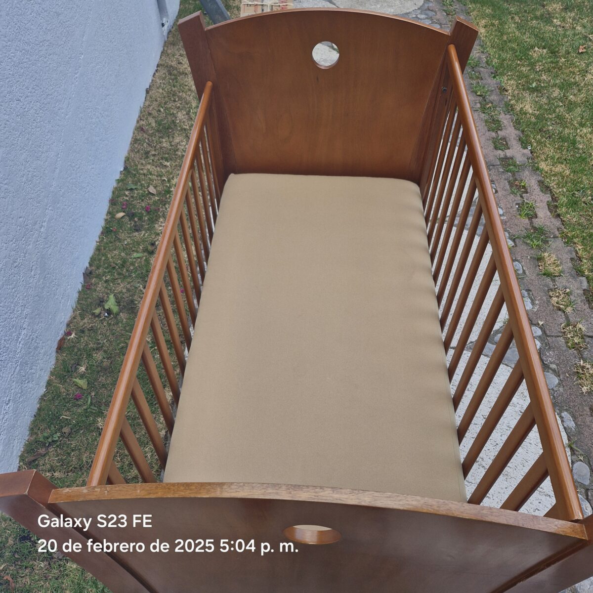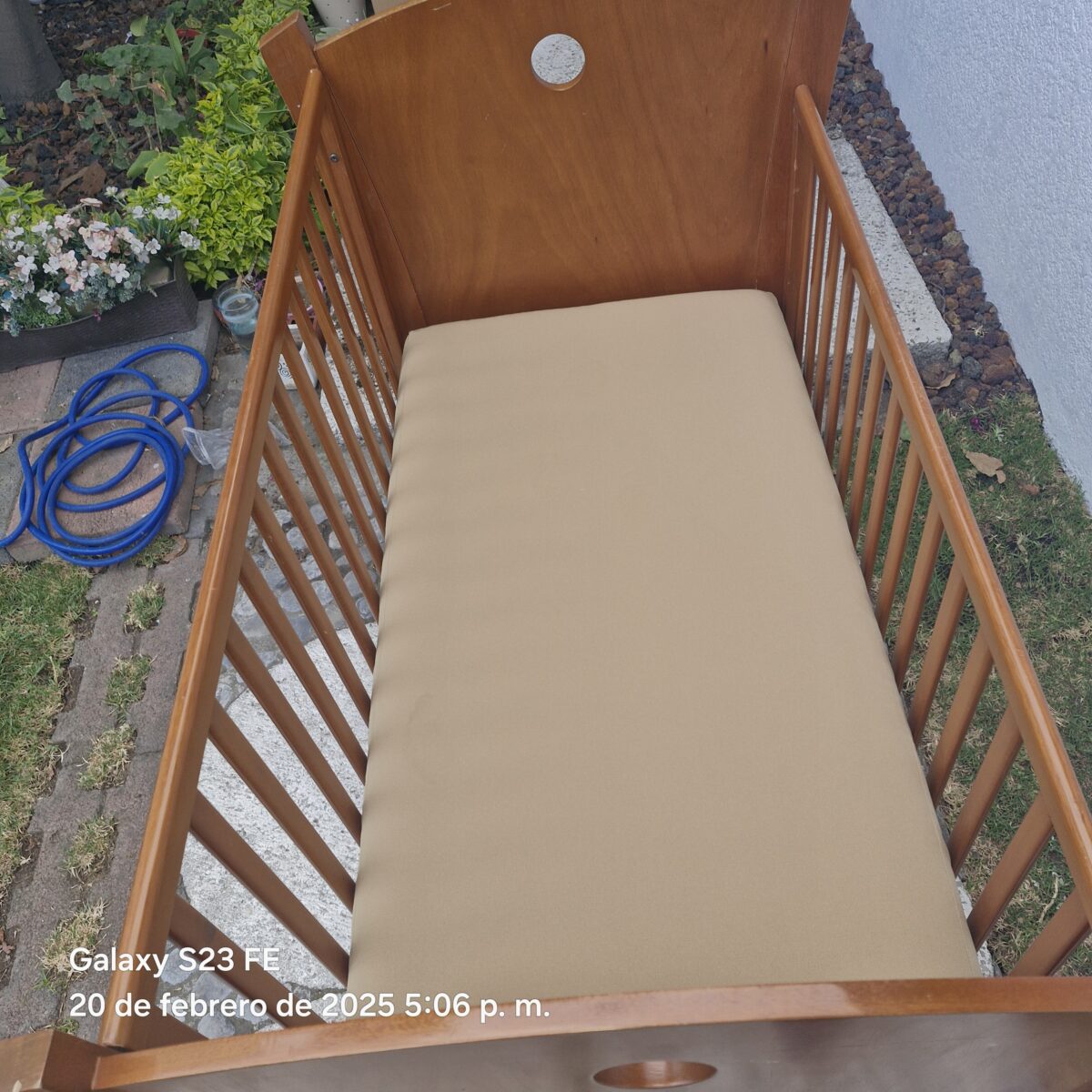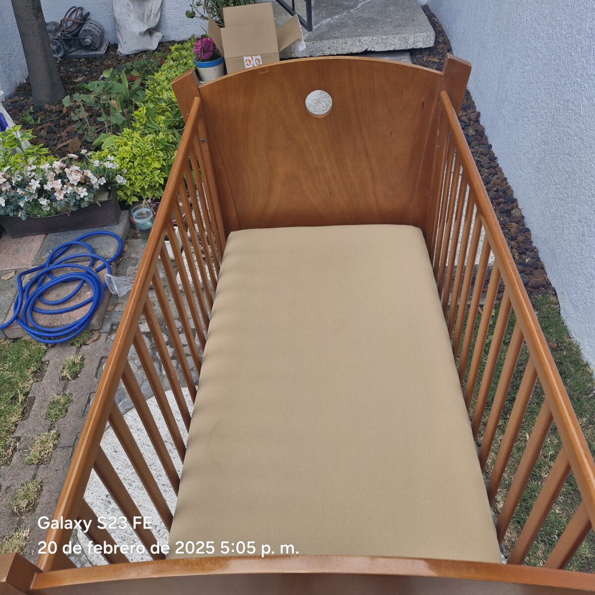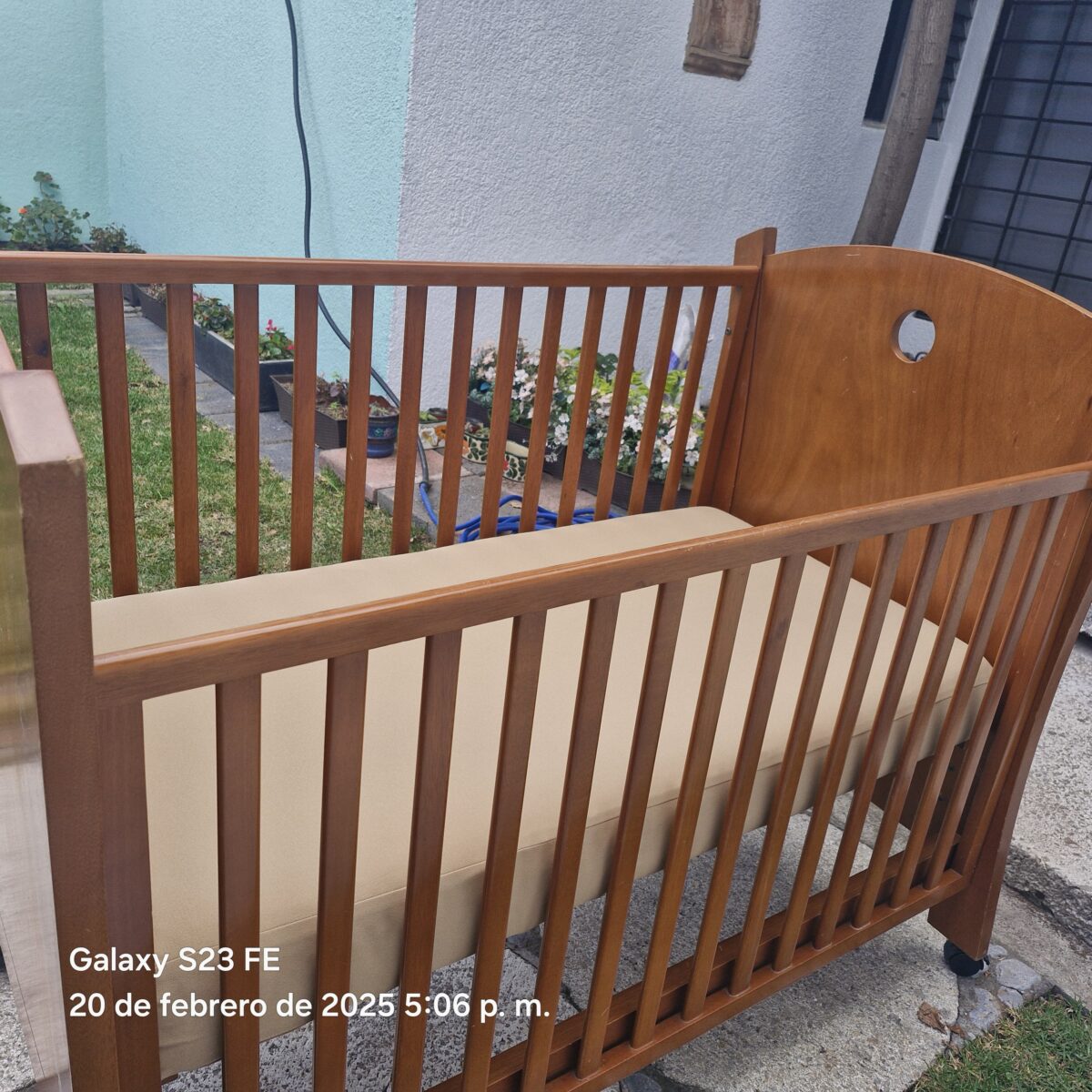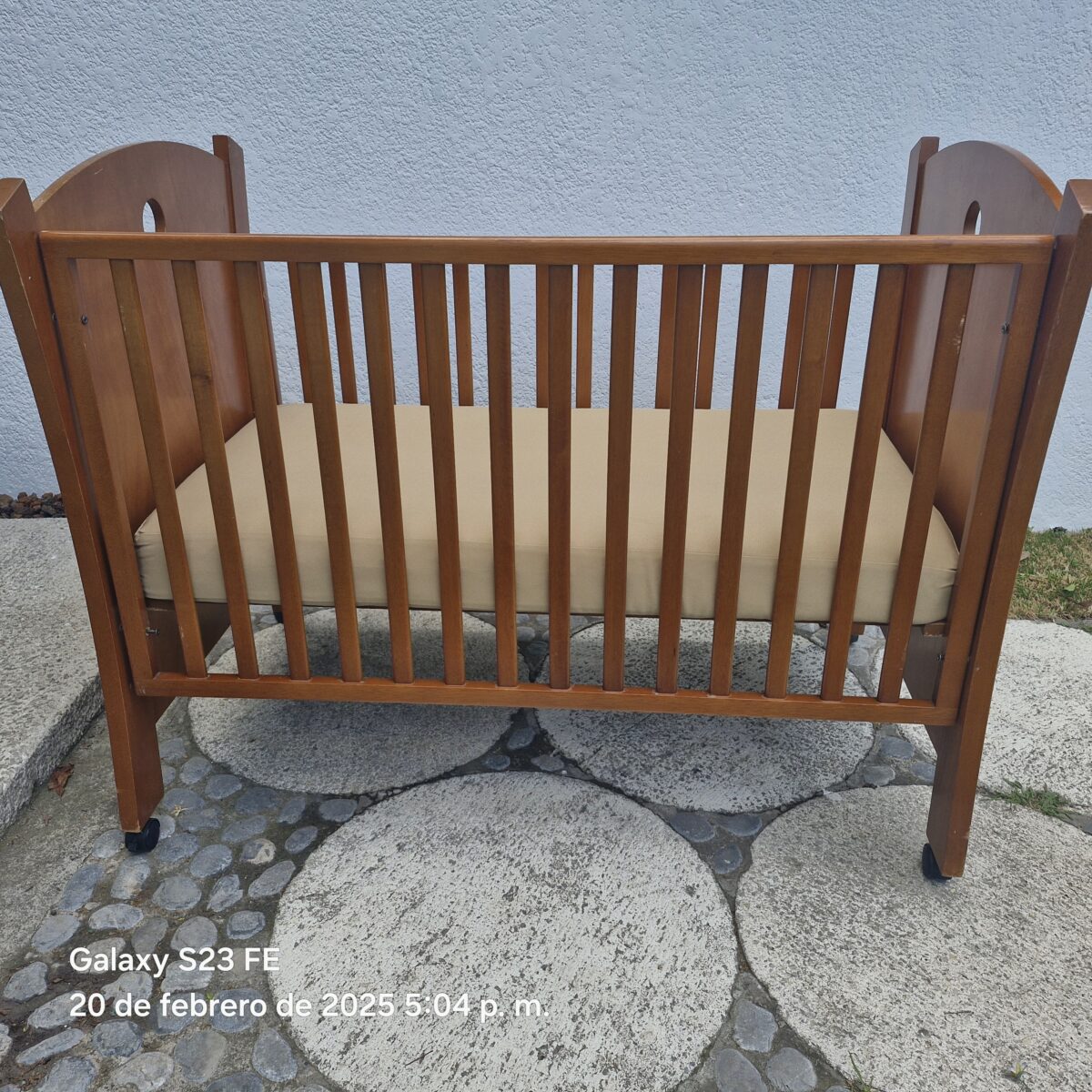 Cuna tamaño estándar INCLUYE colchón. Mide 70×130 cm. Tiene 2 alturas para el colchón. El barandal baja a la mitad y sube. Tiene llantitas con freno para moverla fácilmente. Tiene algunos rallones y una reparación en el barandal que no afectan su funcionamiento. La tenía en casa de mi mamá para acostar a las bendis para la siesta.