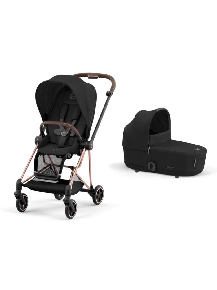 Incluye capazo Lux, hamaca y chasis, con cuatro acabados de chasis disponibles: Rosegold, Matt Black, Chrome Brown y Chrome Negro. La suspensión delantera y trasera, junto con las ruedas de goma EVA anti-pinchazo, garantiza una marcha suave y segura sobre cualquier superficie.