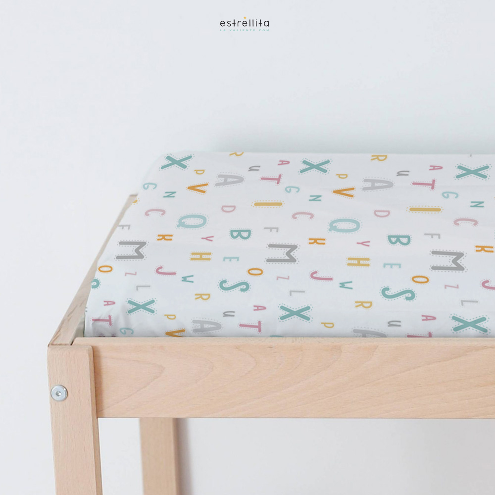 La funda colchoneta cambiador bebé Abecedario de Estrellita la Valiente es un accesorio práctico y seguro para cubrir la colchoneta de cambio del bebé. Fabricada con tejido 100% algodón orgánico, proporciona suavidad, confort y seguridad en cada cambio de pañal.