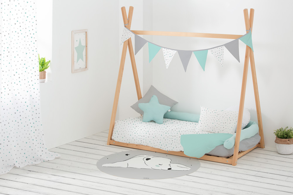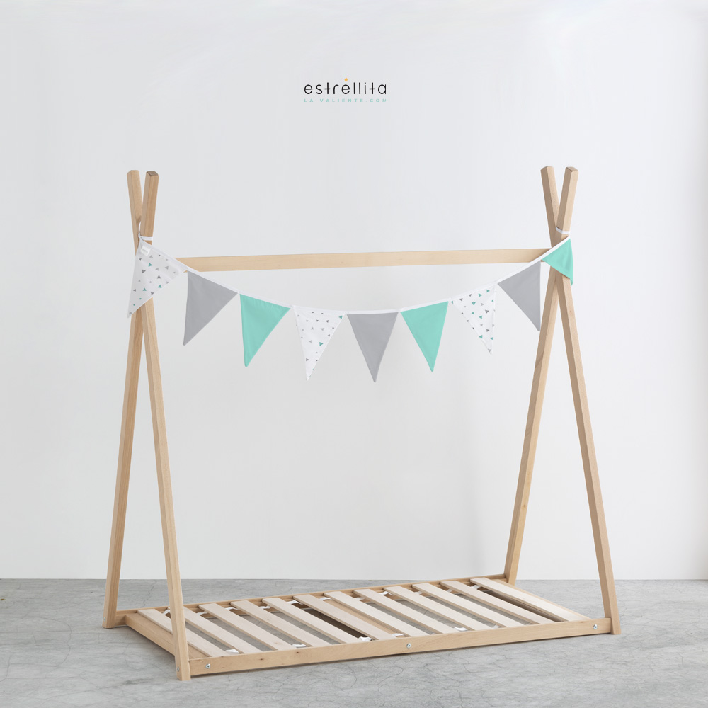 Esta guirnalda la puedes combinar y coordinar con el resto de artículos de nuestras colecciones: Triángulos gris y mint, liso gris y liso mint.