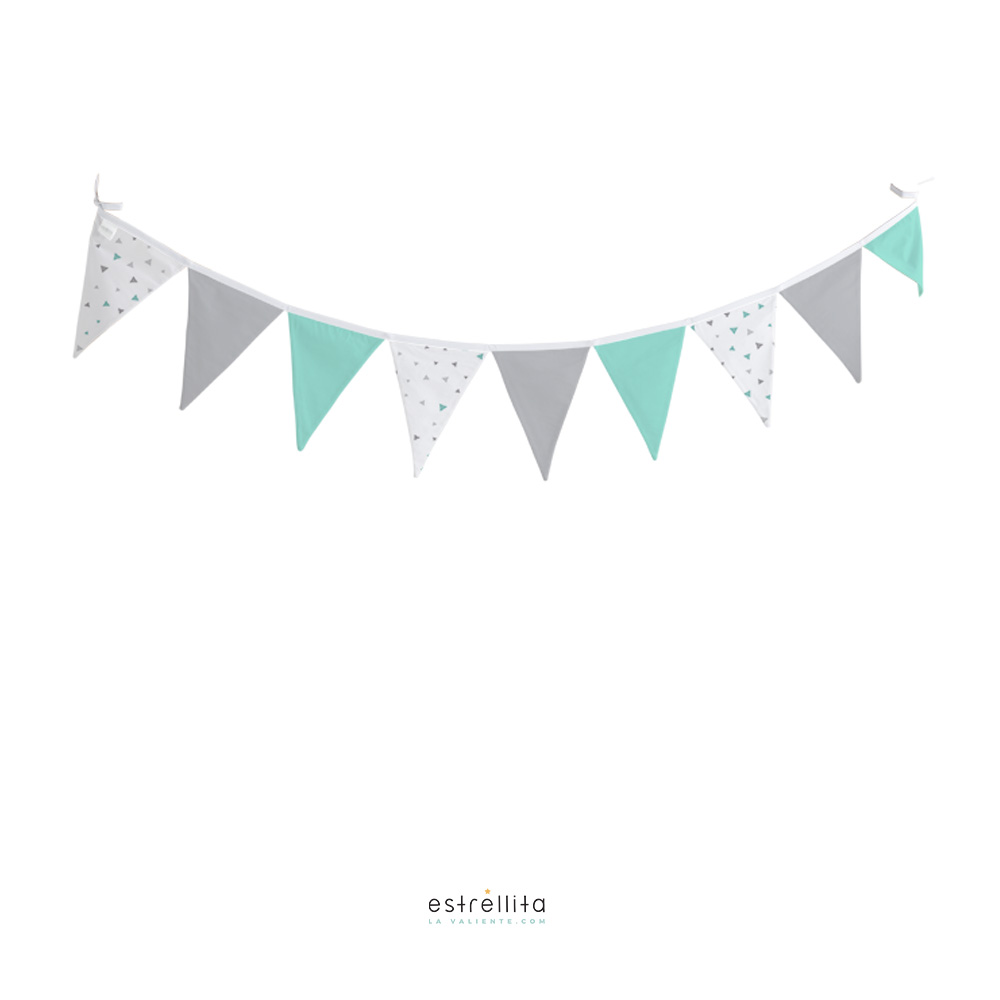 La guirnalda de banderines con tonos de triángulos gris y mint gris mint es una bonita combinación para decorar la habitación de tu peque.