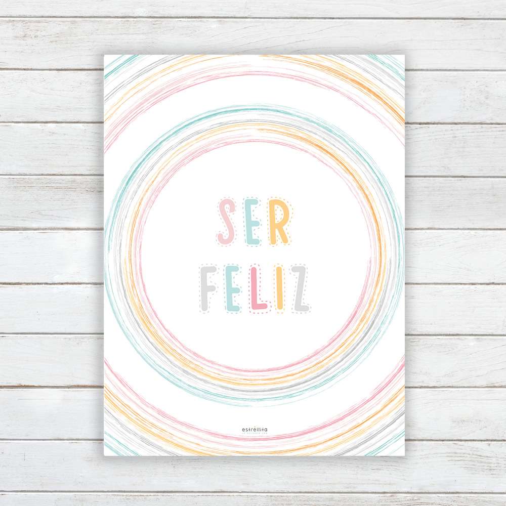 Esta lámina decorativa infantil varios círculos con diversos colores y en su interior lleva escrita la palabra SER FELIZ.