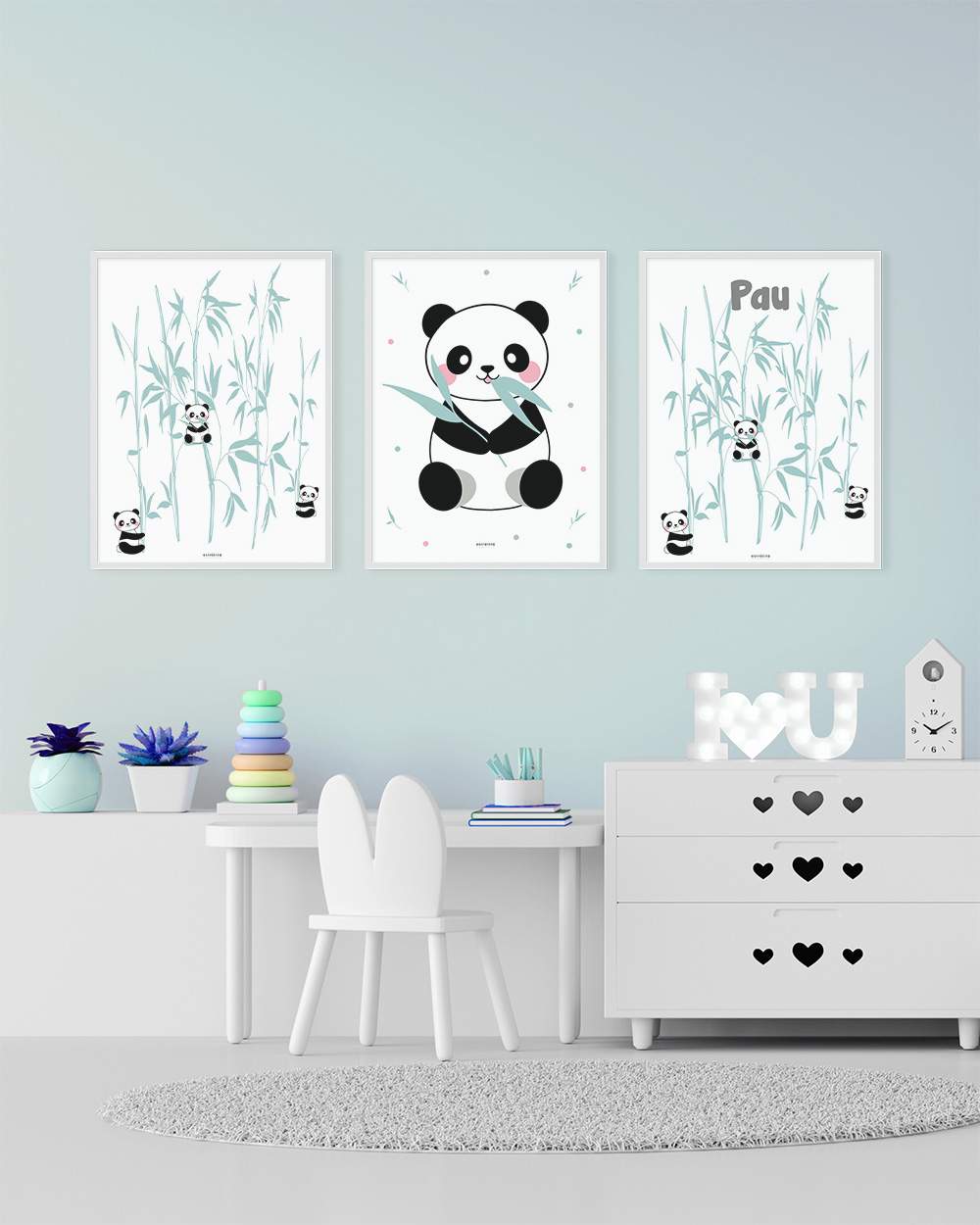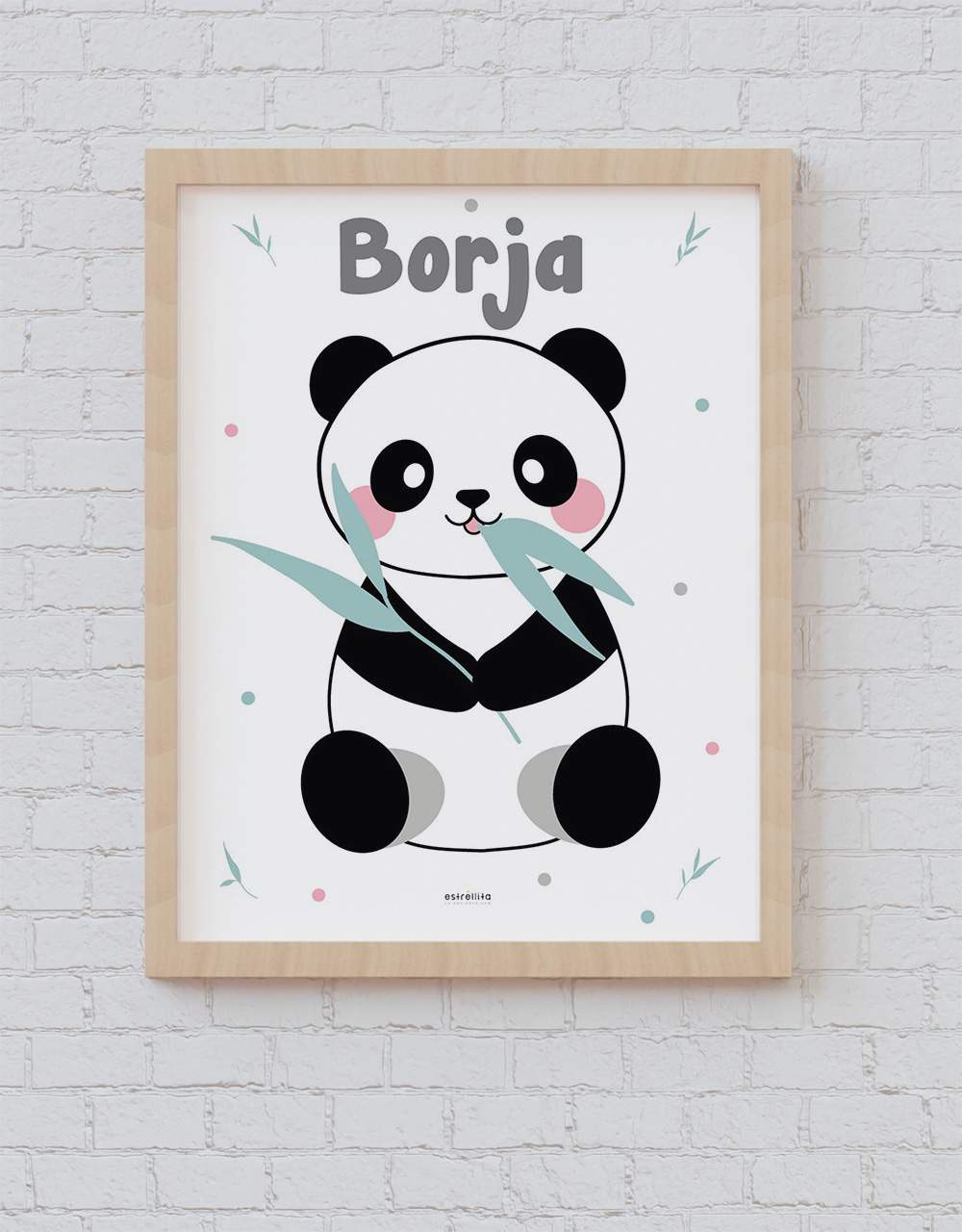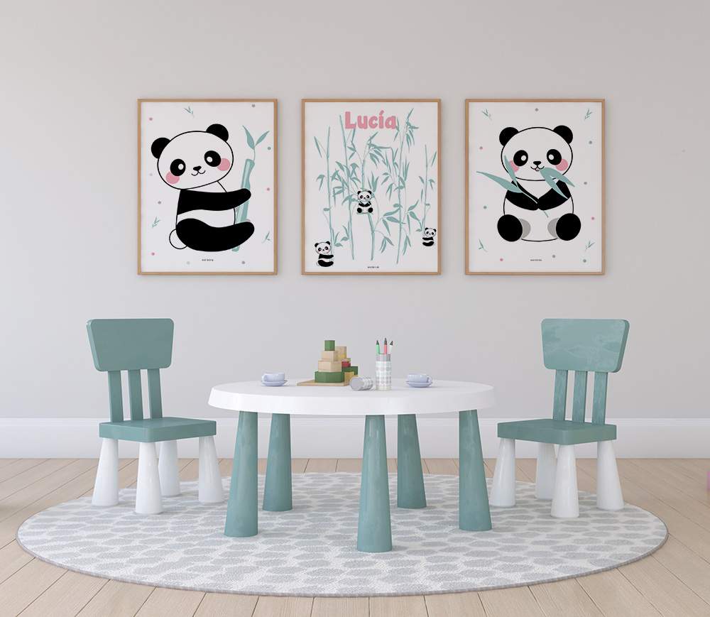 Lámina Panda comilón es una lámina con un panda comiendo bambú y en las manos sujetando una ramita de bambú, con ramas de bambú mint y topos mint,gris, rosa alrededor. Se trata de una original lámina que Estrellita La Valiente pone a tu alcance para decorar la habitación de tus hijas e hijos. Especialmente si son amantes de la colección Panda.