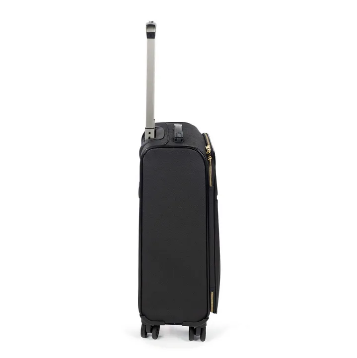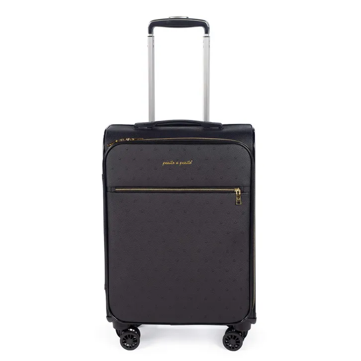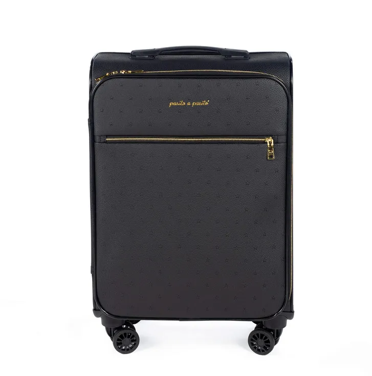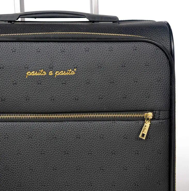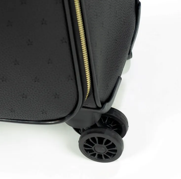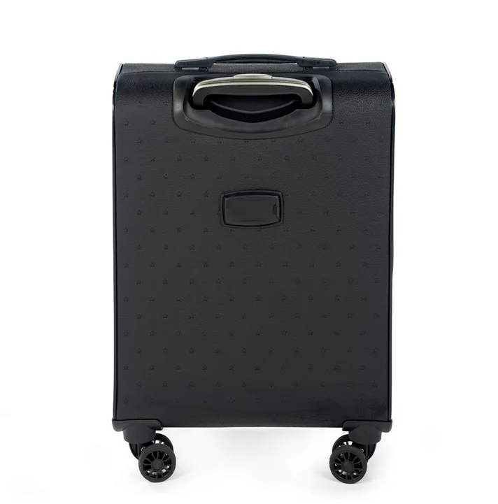 Maleta de cabina London en polipiel negra con estrellas grabadas. Las ruedas son multidireccionales para su cómodo desplazamiento. Tiene el compartimento interior con gomas y un bolsillo con cremallera en la tapa para que esté todo bien ordenado. También tiene un bolsillo exterior con cremallera para tener a mano lo más esencial. Asa telescópica con dos posiciones. Incorpora etiqueta para el nombre en la parte trasera. Los materiales utilizados están libres de colorantes azoicos, ftalatos y sustancias nocivas para la salud. Medida: 35,5x45x21 cm.