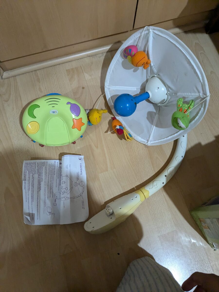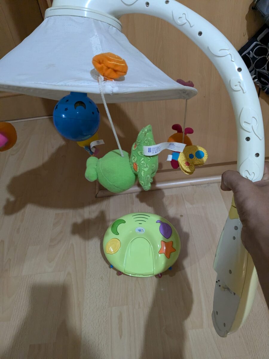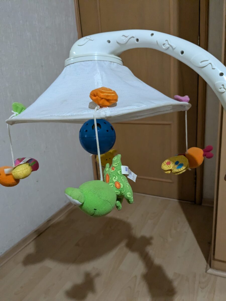 Móvil para bebé seminuevo Con luz. Con sonido. Hecho en plástico. Tipo de batería: 4 pilas tipo D Lugar de montaje: Cuna Juguetes colgantes utilizables por separado: para entretenimiento adicional Fácil colocación en la cuna del bebé: instalación rápida y sencilla al borde de la cuna