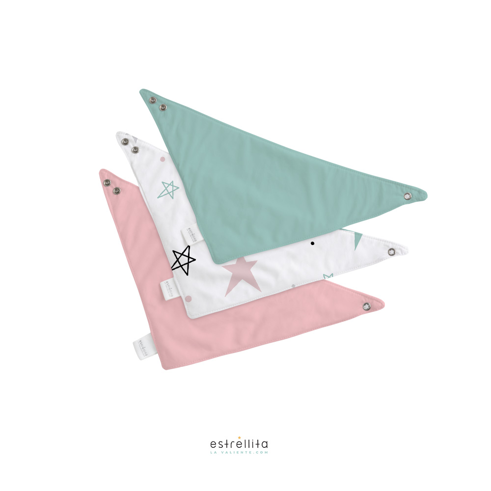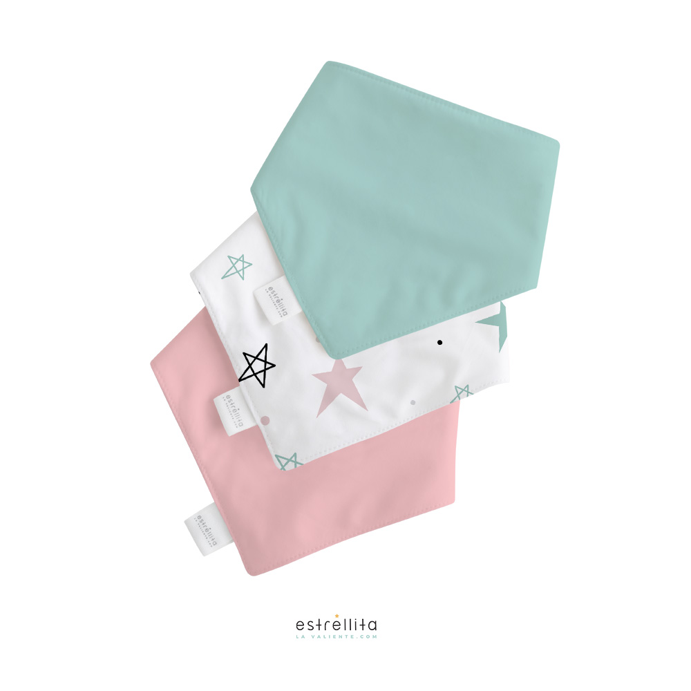 Se vende en pack de 3 unidades, combinando nuestros colores lisos mint y rosa con la colección Noche estrellada Rosa.
