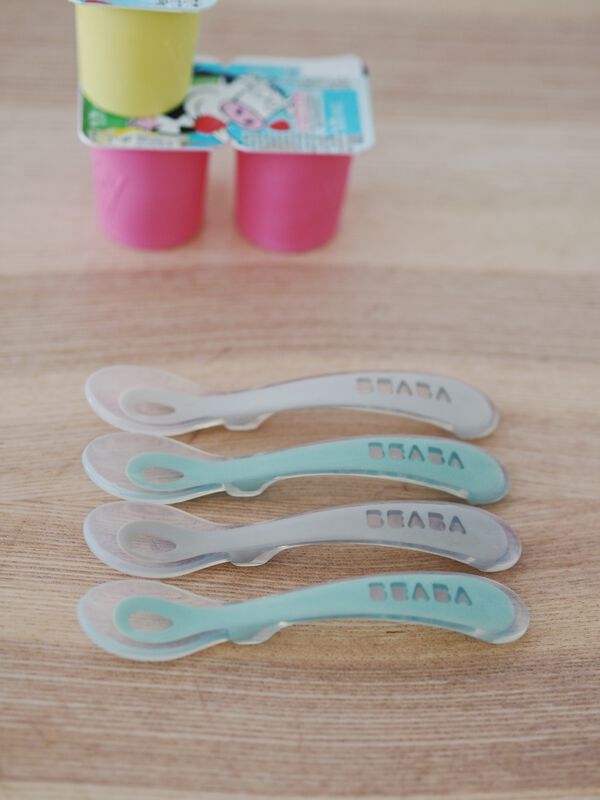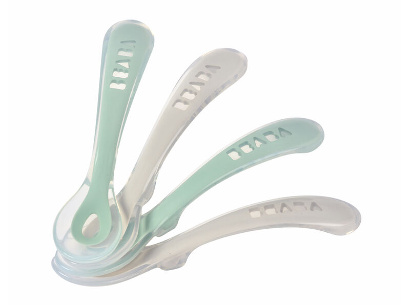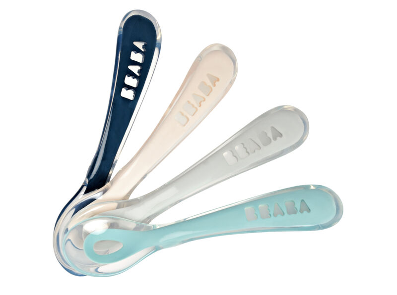 Béaba 4 Cucharas de Silicona 2a Edad 8 Meses y + – Color: Azul Oscuro, Blanco, Gris, Verde de Agua son cucharas ergonómicas para el bebé de 8 meses en adelante, para que aprenda a comer como un adulto.
