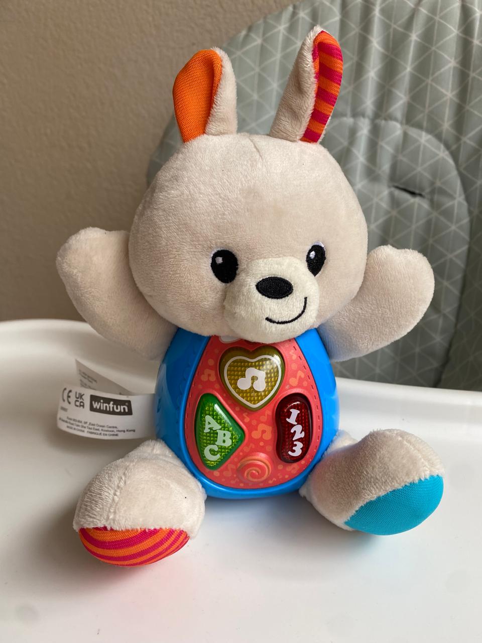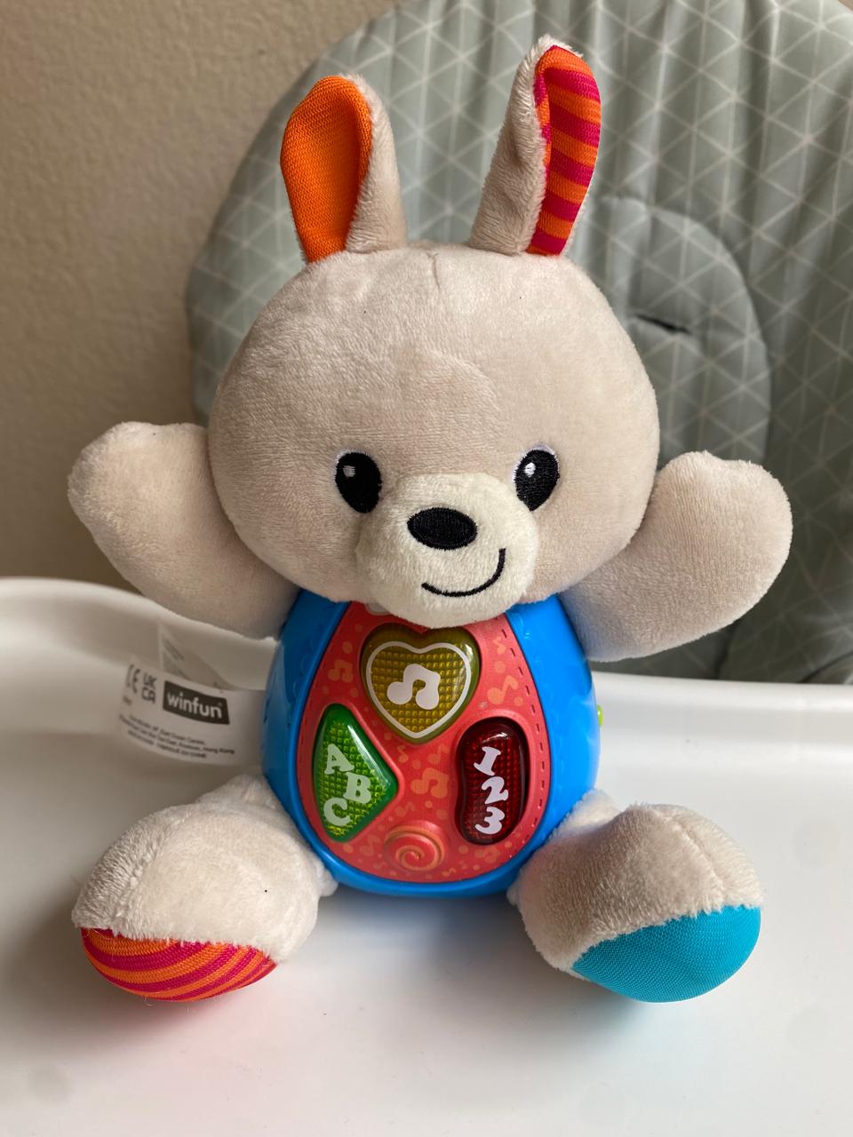 Pack de 2 peluches interactivos para bebé a partir de 6 meses. Estado casi nuevo, solo que no tienen empaque. Mi bebé no jugó con ellos. Ambos peluches suenan perfectamente al presionar sus botones y emiten la luz correspondiente.