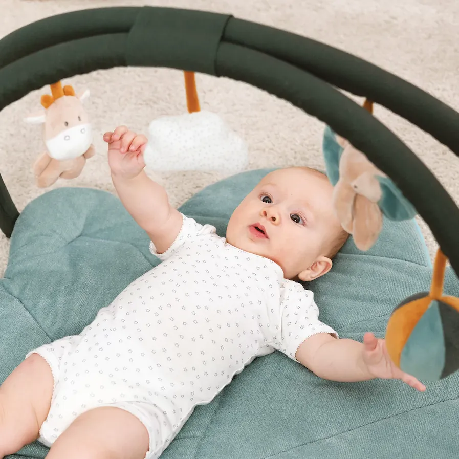 Atrae y estimula los sentidos con numerosas actividades: papel triturado, chirridos, sonajero, espejo, peluches desmontables.