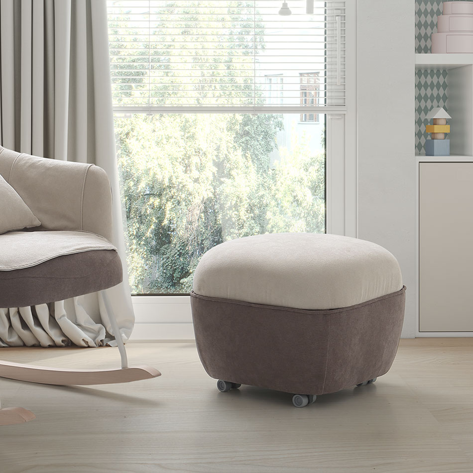 Sus cuatro ruedas hacen que su transporte sea sencillo, y tiene un práctico contenedor de almacenaje en su interior. Además, está disponible en los tres colores de la mecedora, para poder combinarlos perfectamente: Rosa Tierra – Gris Claro, Gris Claro – Gris Noche, Beige – Marrón.