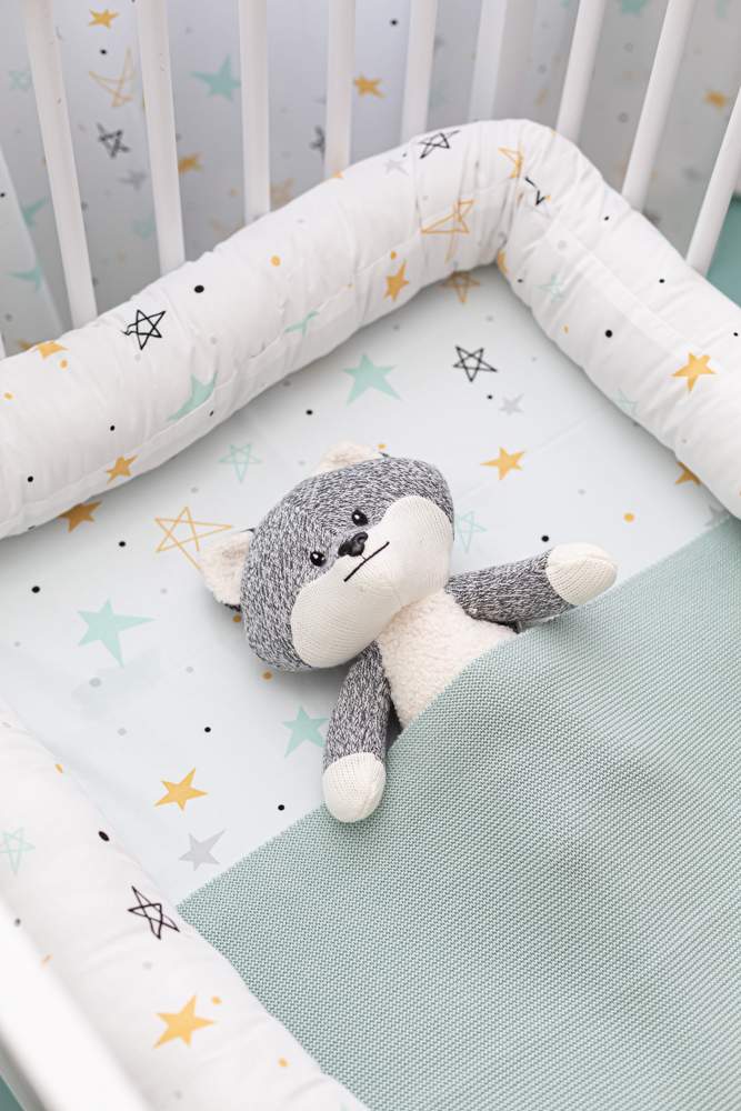 La función principal de este rulo protector para cuna es limitar el espacio de movimiento del bebé y evitar los roces contra las barandillas, recreando un ambiente cómodo y familiar.