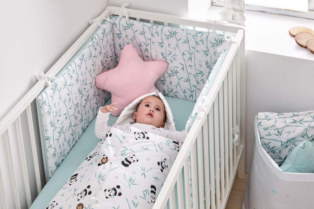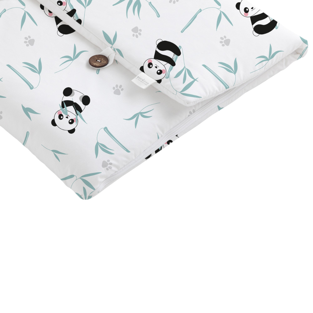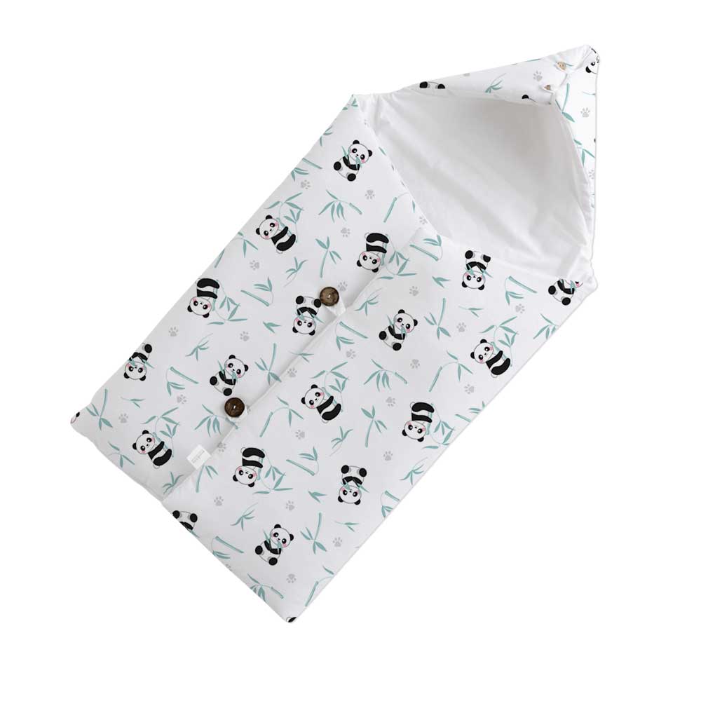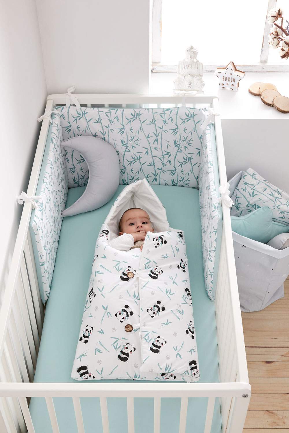 Este saco algodón para recién nacido Panda es el complemento perfecto de los descansos de los bebés. Se trata de un original saco que te permitirá proteger al pequeño de corrientes de aire o de cambios de temperatura que lo puedan enfermar. Se ha realizado con un tejido 100% algodón orgánico, que es muy placentero al tacto. Este tejido pertenece a nuestra colección Panda, con dibujos de un oso panda comiendo bambú y otro cogiendo bambú, con ramas de bambú y huellas de oso panda. Con colores negro, gris y mint.