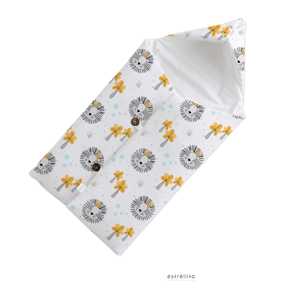 Este saco algodón para recién nacido Rey de la Selva es el complemento perfecto de los descansos de los bebés. Se trata de un original saco que te permitirá proteger al pequeño de corrientes de aire o de cambios de temperatura que lo puedan enfermar. Se ha realizado con un tejido 100% algodón orgánico, que es muy placentero al tacto. Este tejido pertenece a nuestra colección Rey de la Selva, que es tendencia actual, además se trata de un dibujo dulce, sencillo y elegante a la vez.