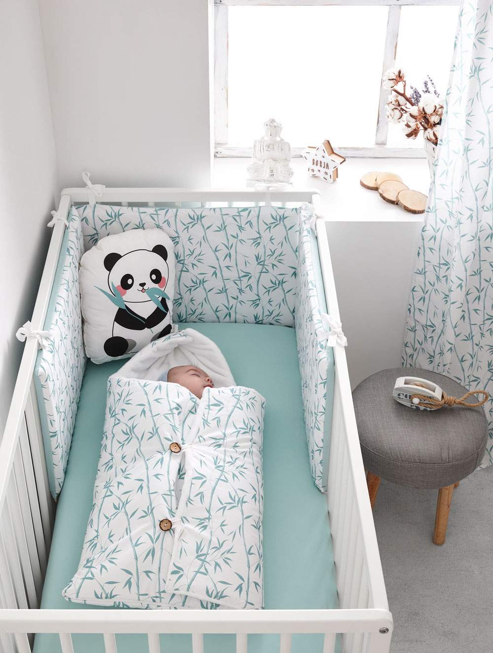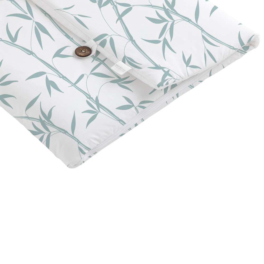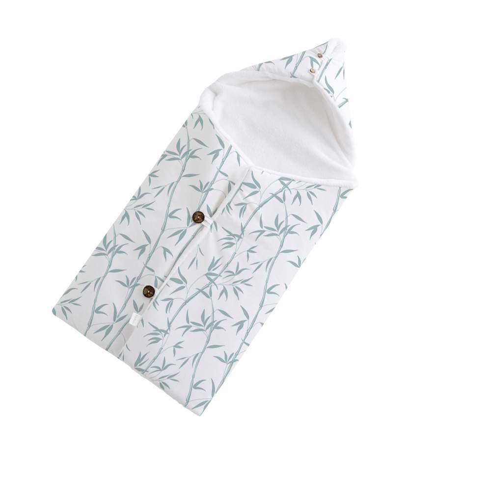 El tejido exterior está realizado con tejido 100% algodón orgánico con estampado de nuestra colección Bambú. El interior del saco polar es tejido suave polar de poliéster en color blanco liso.