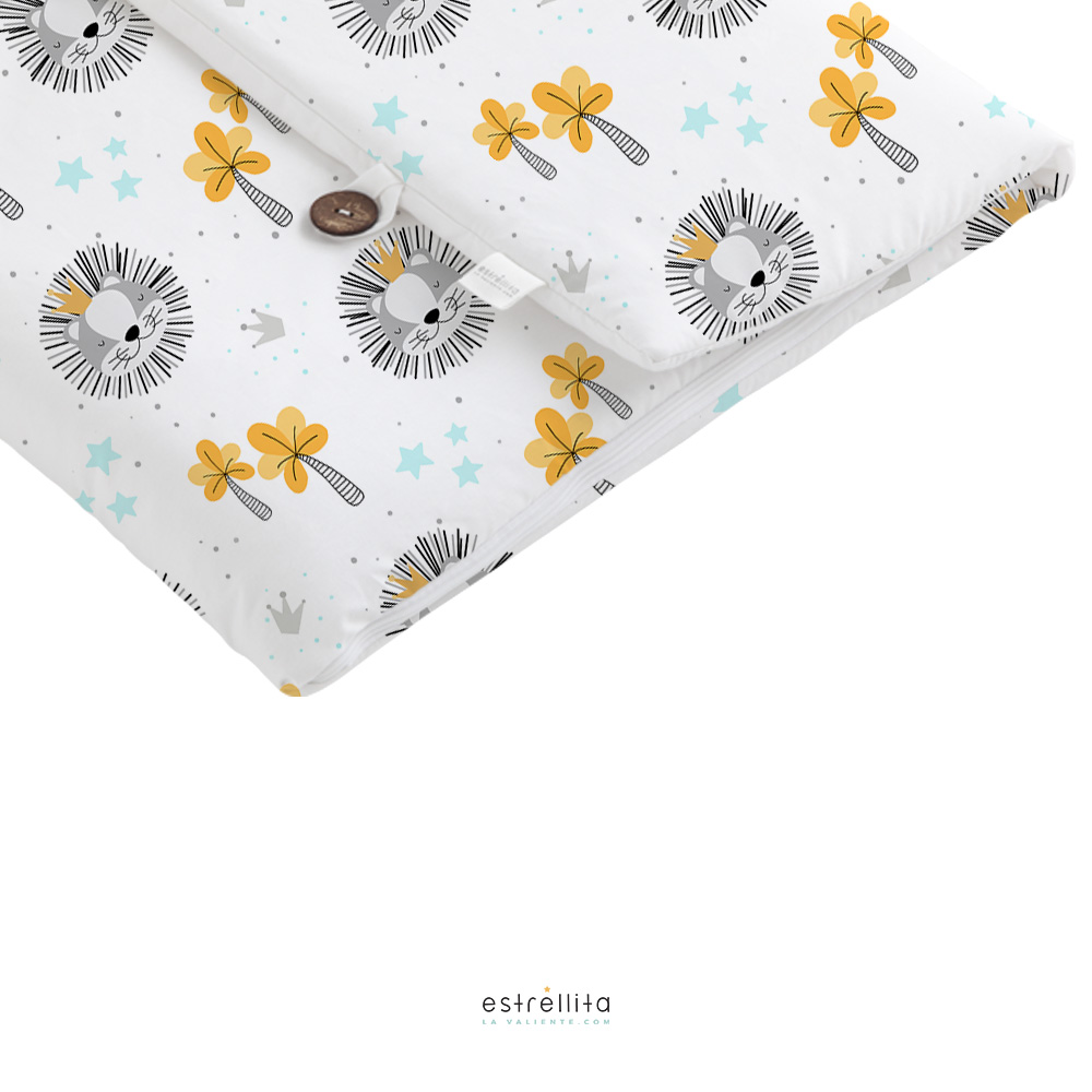 El tejido exterior está realizado con tejido 100% algodón orgánico con estampado de nuestra colección Rey de la Selva. El interior del saco polar es tejido suave polar de poliéster en color blanco liso.