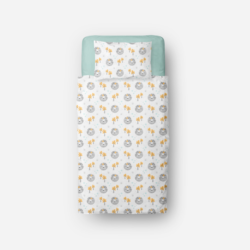 Saco nórdico con estampado rey de la selva + sábana bajera mint (con cremallera para unir a la funda) + funda de almohada.