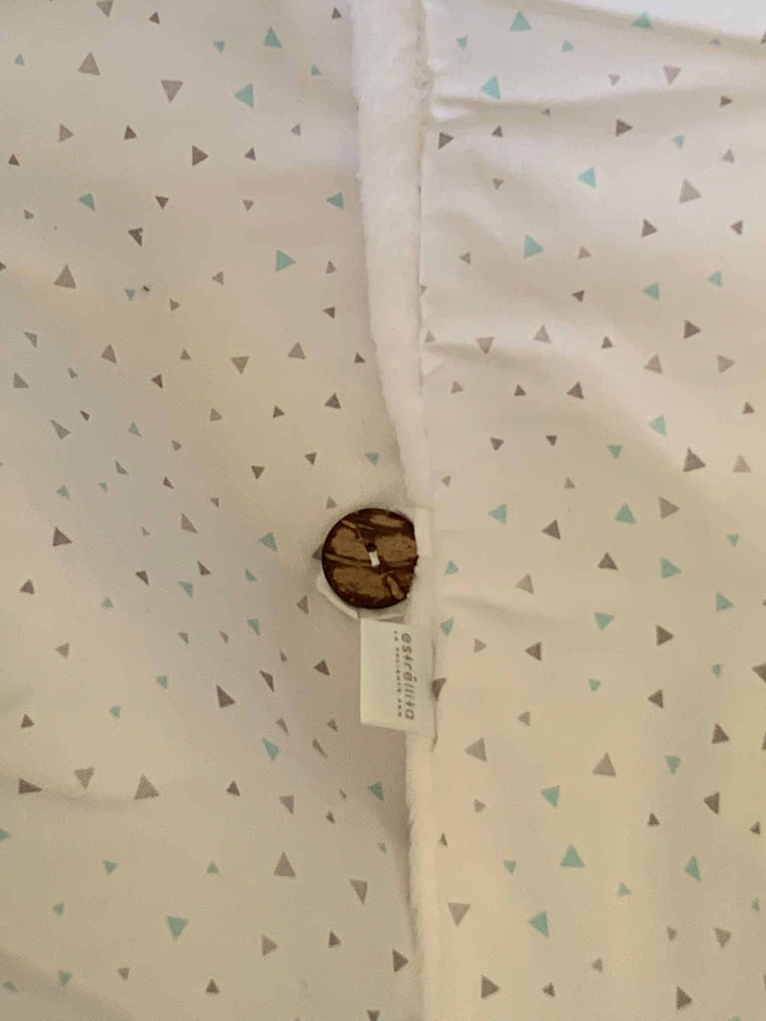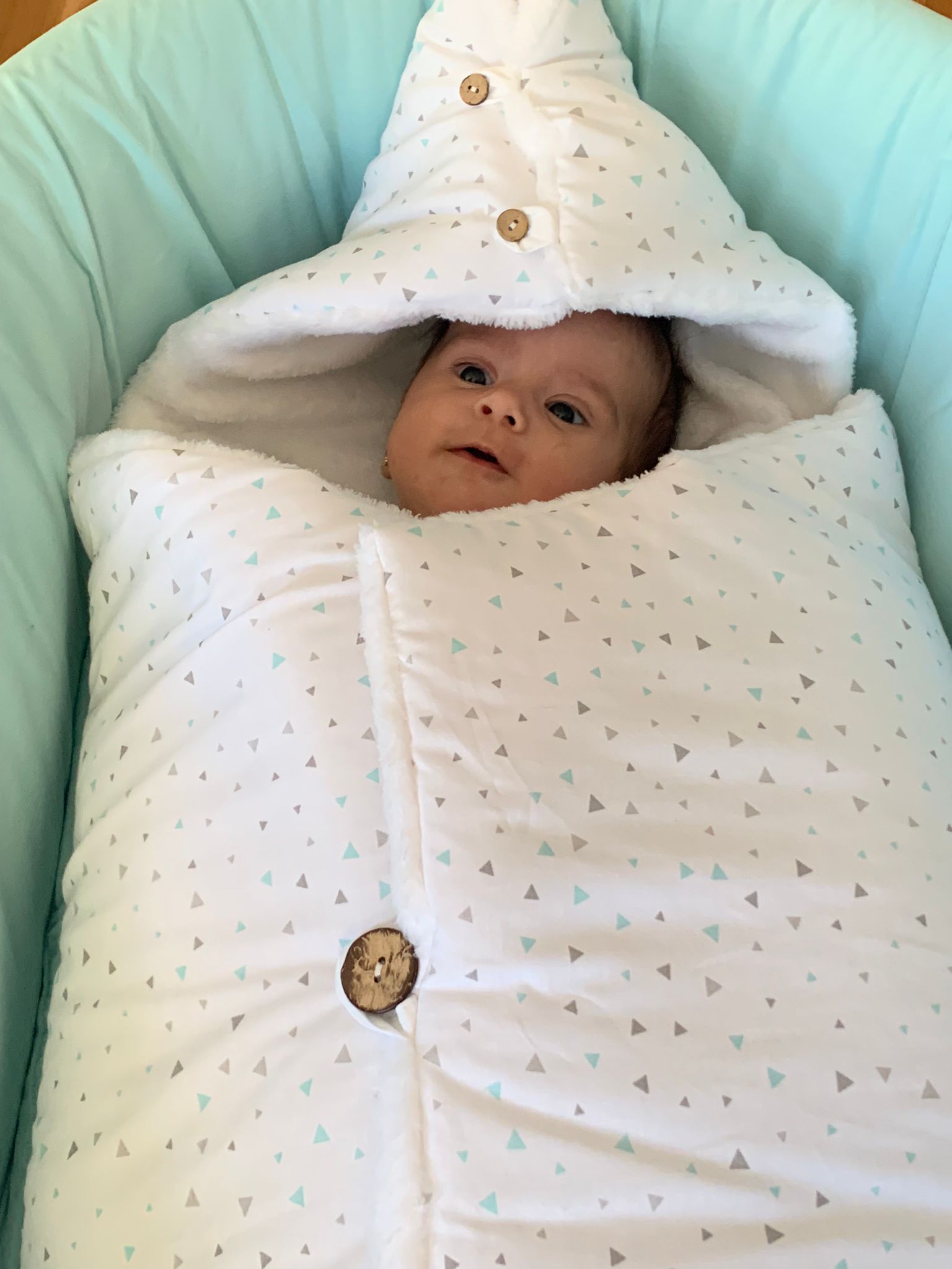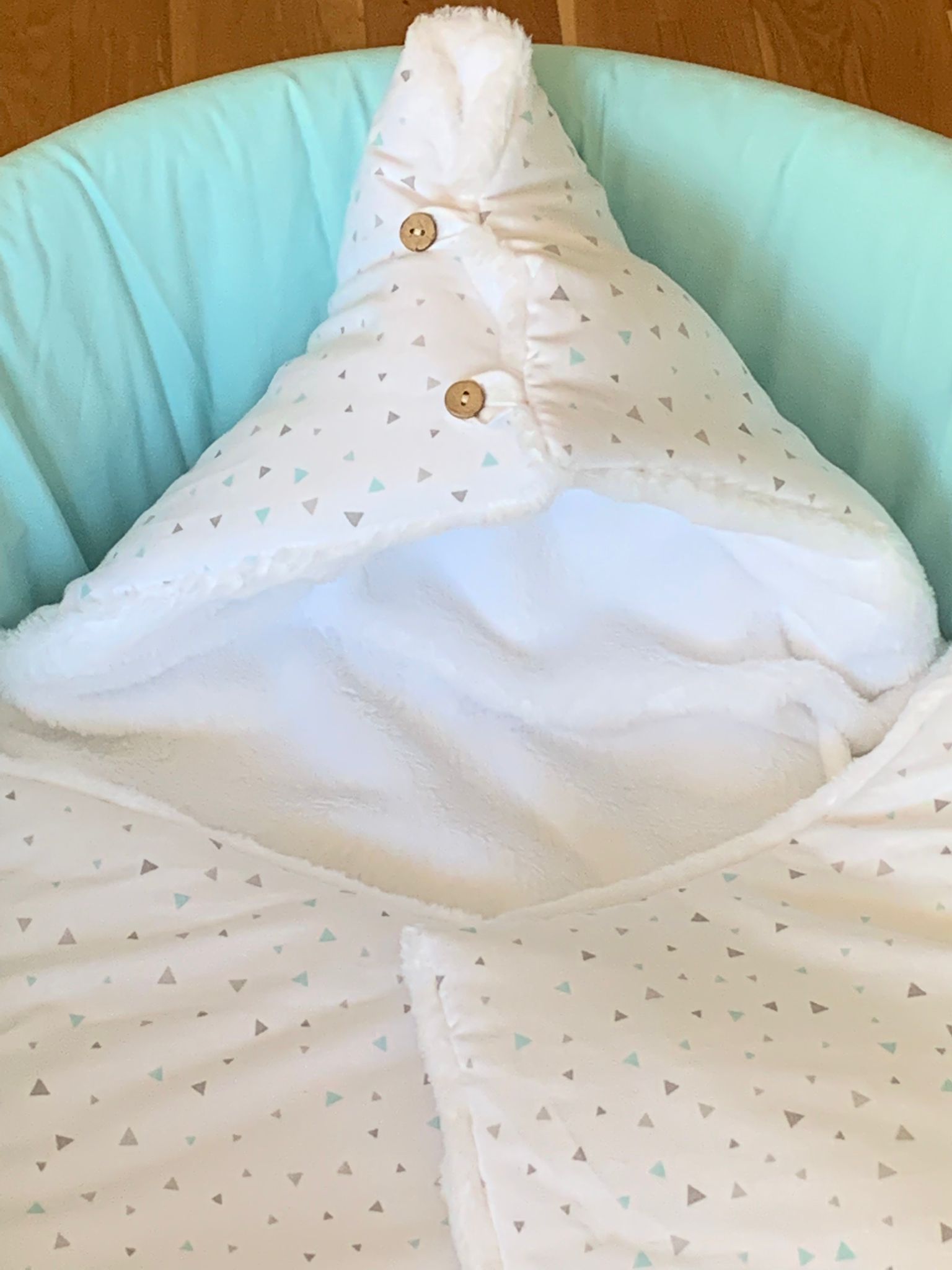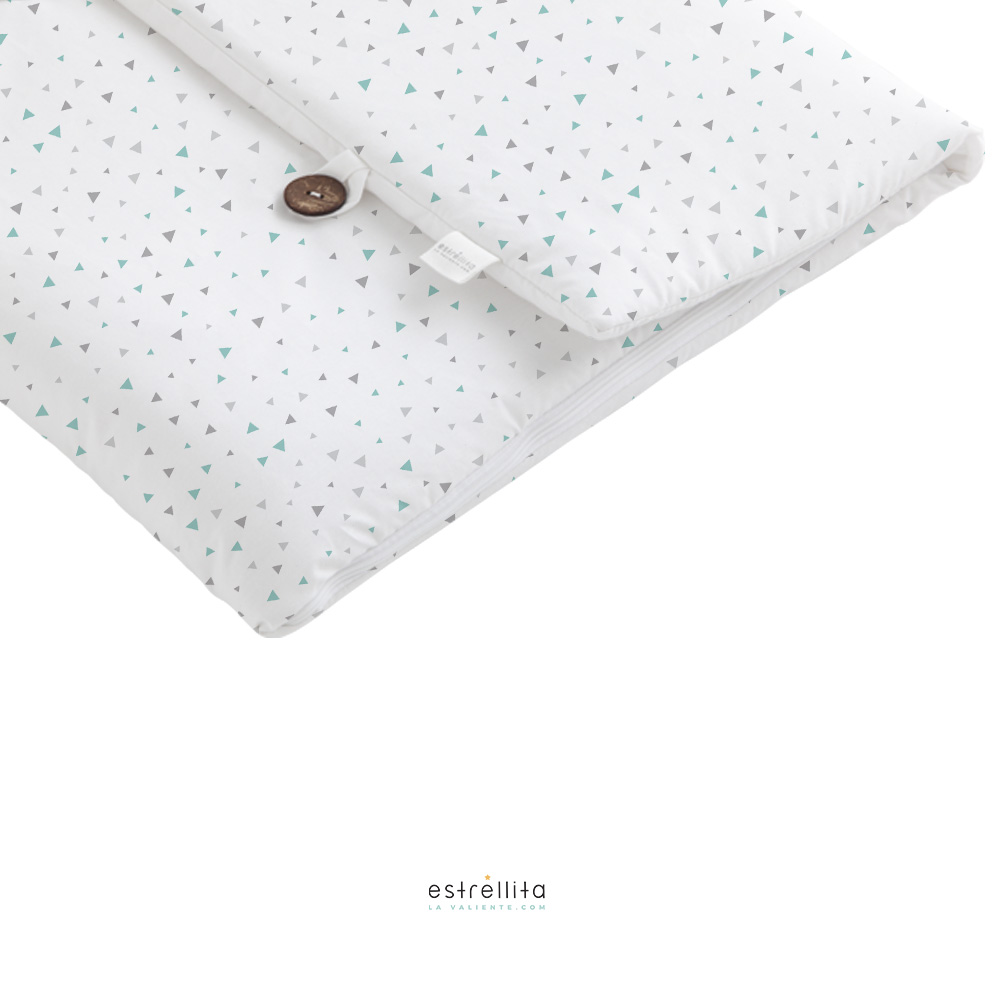 Este saco polar recién nacido triángulos gris y mint es el complemento perfecto de los descansos de los bebés. Se trata de un original saco que te permitirá proteger al pequeño de corrientes de aire o de cambios de temperatura que lo puedan enfermar. Se ha realizado con un tejido interior polar 100% poliéster, muy placentero y calentito.