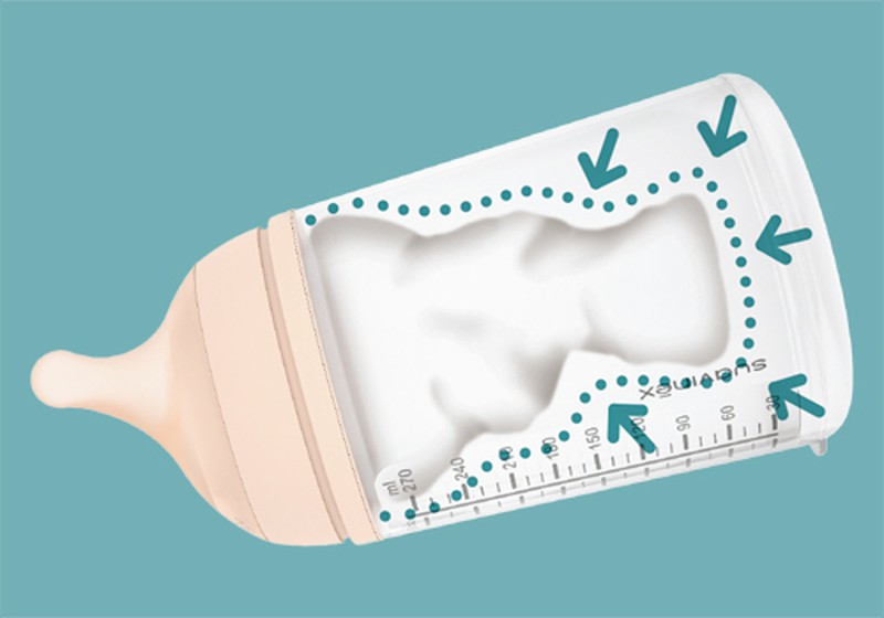 El biberón anticólico ZERØ.ZERØ™ reproduce fisiológicamente las glándulas mamarias durante la succión.