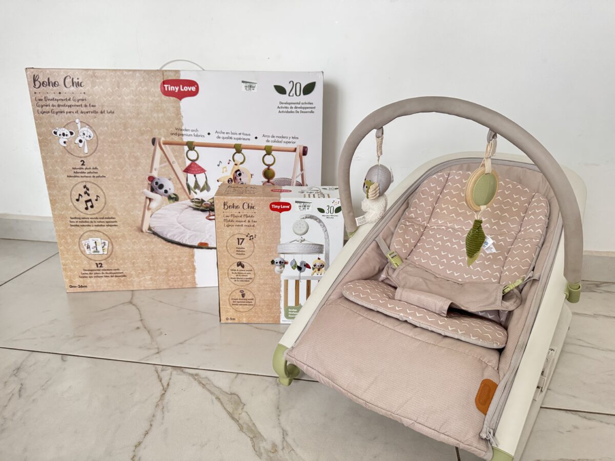Set a juego de móvil para cuna, bouncer y gimnasio para bebé marca Tiny Love en Boho Chic y l gimnasio y el móvil incluyen caja y manual de uso, el bouncer tiene las gomas de nuevo.