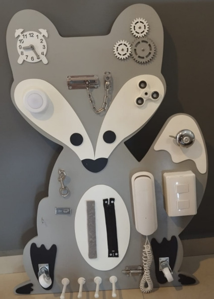 Es un board de estimulación de madera con formar de zorro. Incluye spinner, telefono, zipper, etc para que tu hijo comience a desarrollar habilidades motrices.