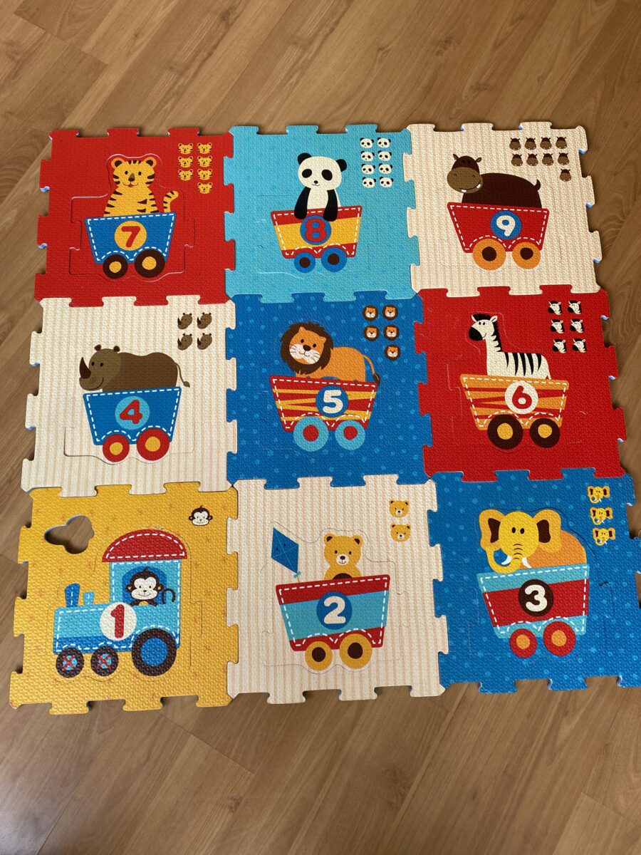 Tapete de Foam con animales y números. Perfecto para espacios pequeños, mi hija lo usó desde el año y ahí se sentaba a jugar perfectamente. Es desmontable y apilable.