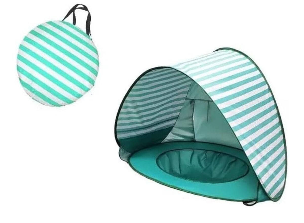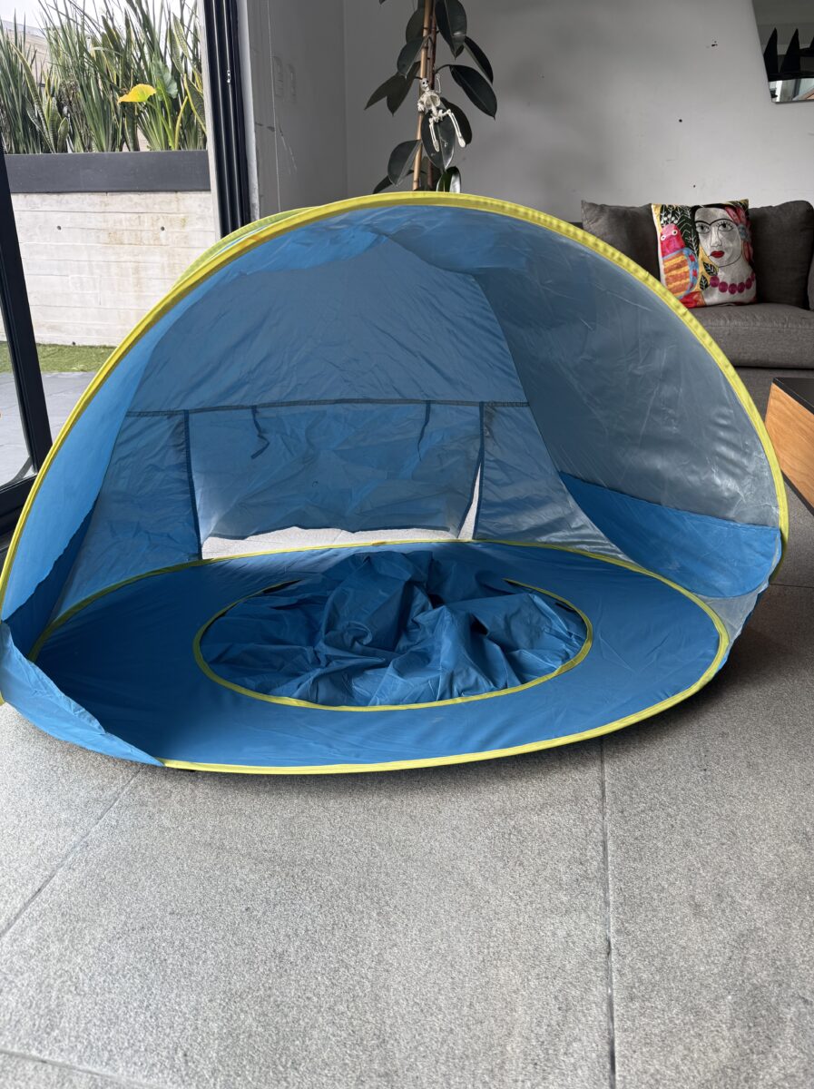 Tienda de campaña para playa. Color azul. Protege del sol. Tiene un detalle en la parte de abajo, no impide en lo mínimo su uso