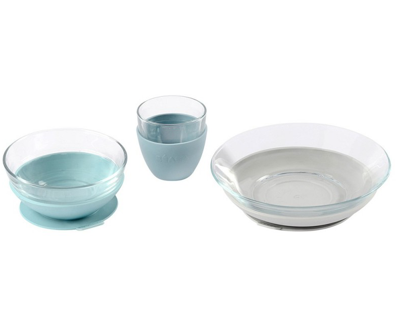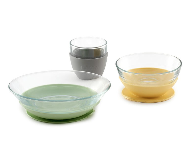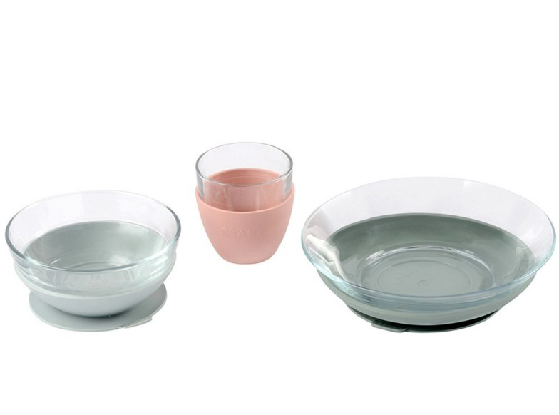 El pack incluye un plato, un bol y un vaso de cristal además de una base de material flexible. Diseñadas para evitar accidentes, las bases flexibles del plato y del bol disponen de ventosas para pegarlas a la mesa o a la de la trona.