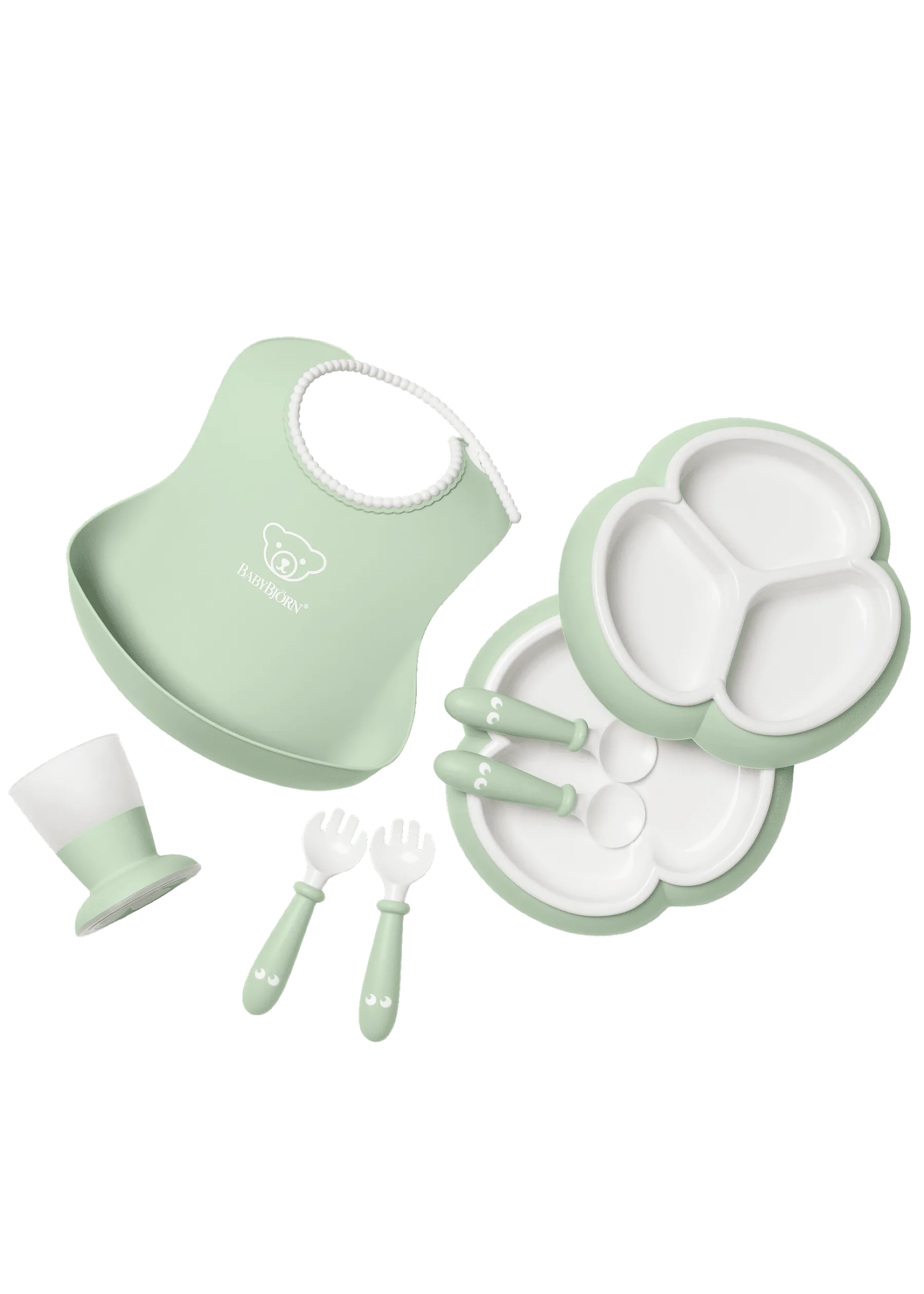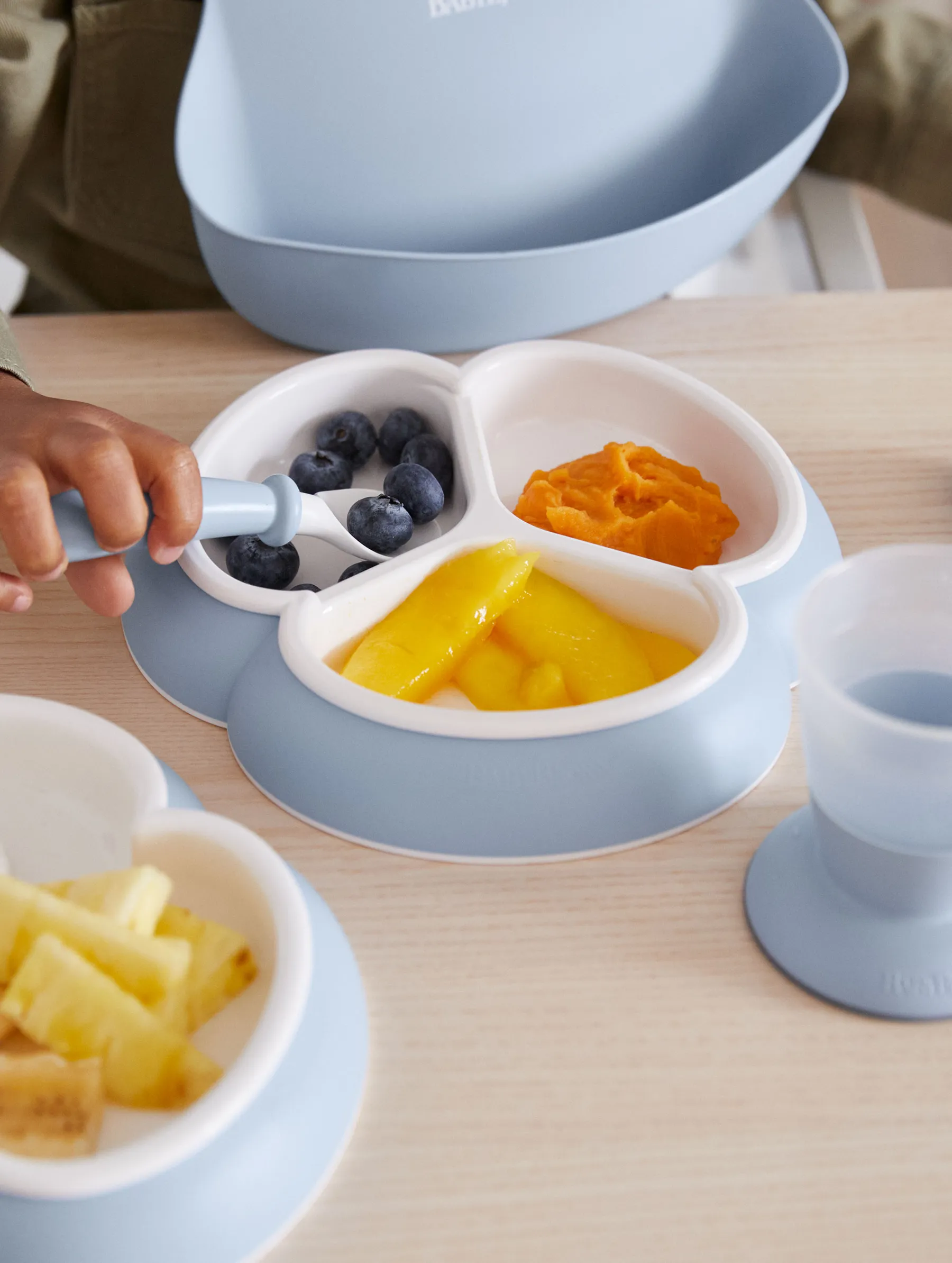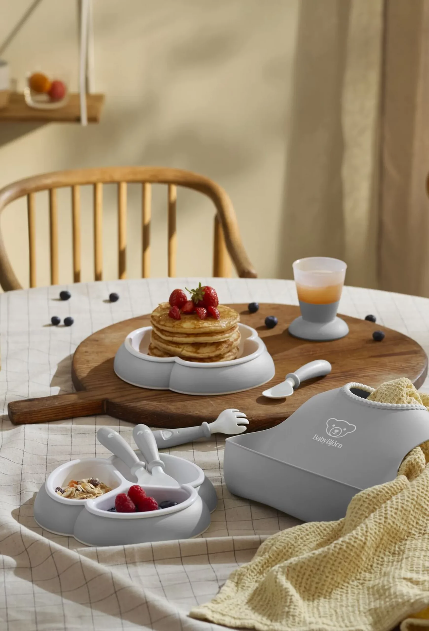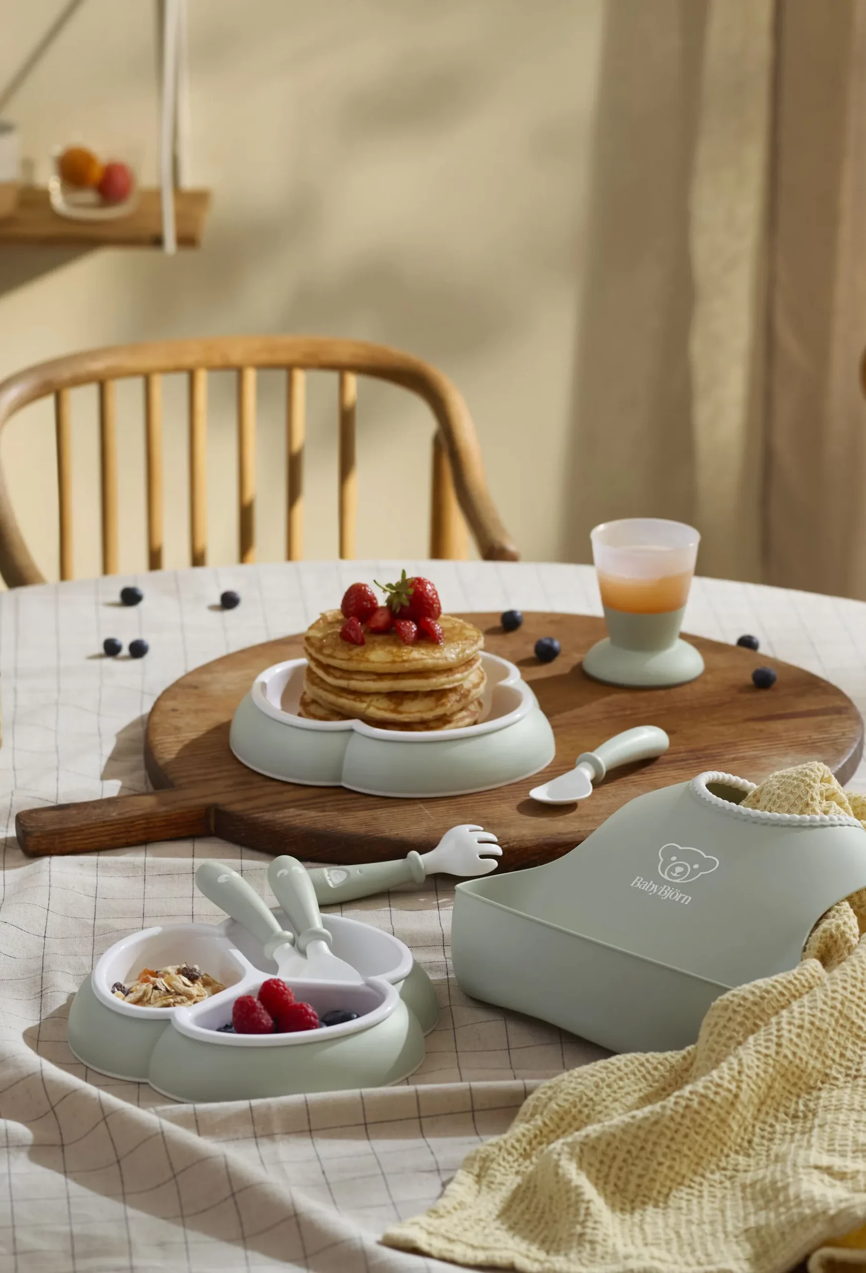 Perfecta para tu peque. Una vajilla completa con babero diseñada para hacer que las comidas sean más fáciles, divertidas y con menos derrames de BabyBJörn. Disponible en Doña Coletas.
